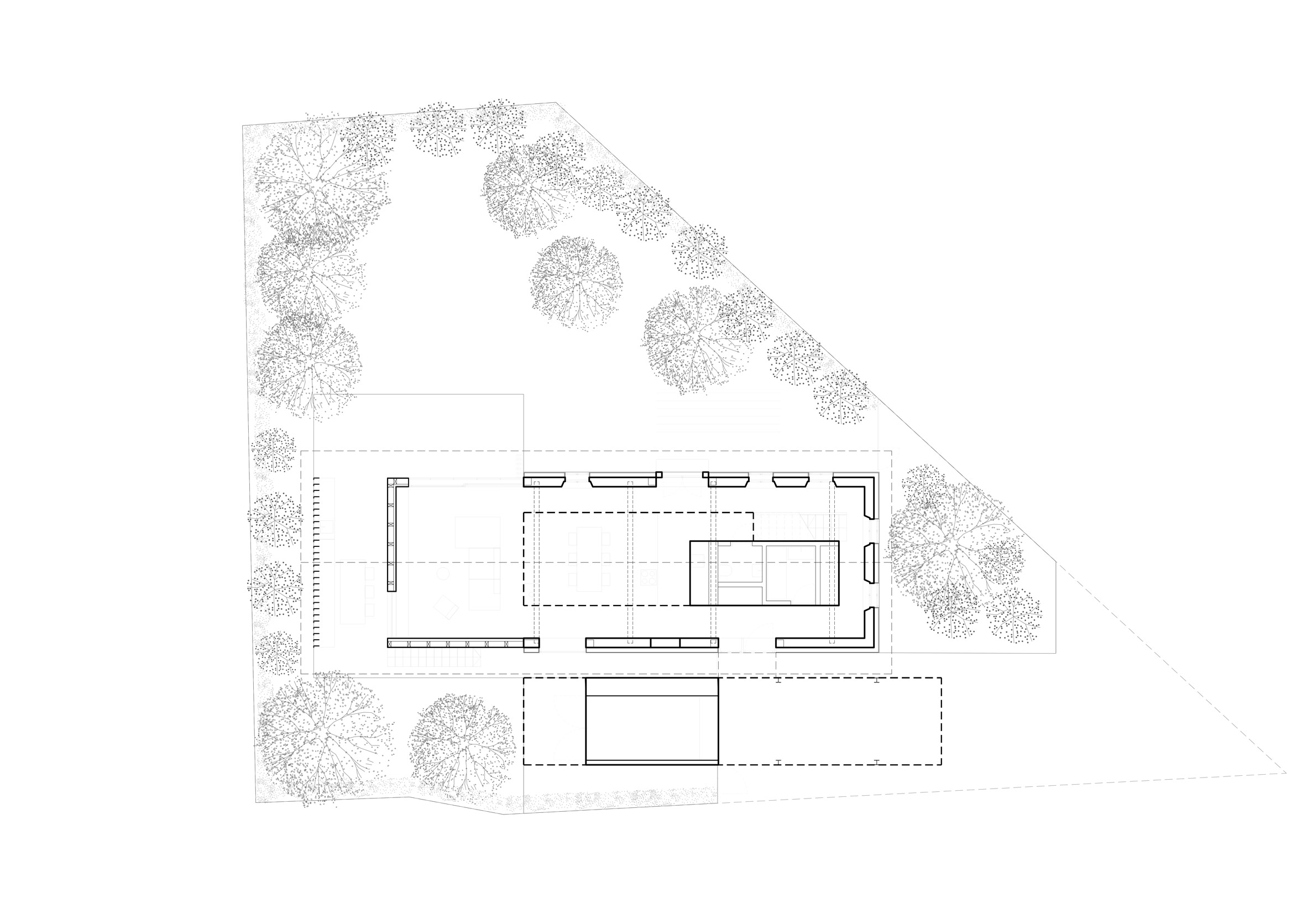 Glavni životni prostor smešten je u delu kuće koji je proširen, a koji ima dvostruku spratnu visinu i prati zabatnu formu eksterijera.