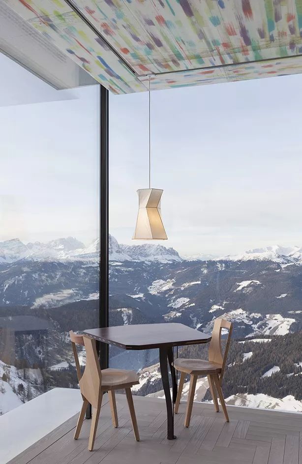 Dizajner iz Milana Martino Gamper mudro se uzdržao od preterivanja prilikom oblikovanja enterijera – nazubljene ivice njegovih poligonalnih lampi i stolica suptilno odražavaju tektonski pejzaž prekriven snegom spolja.