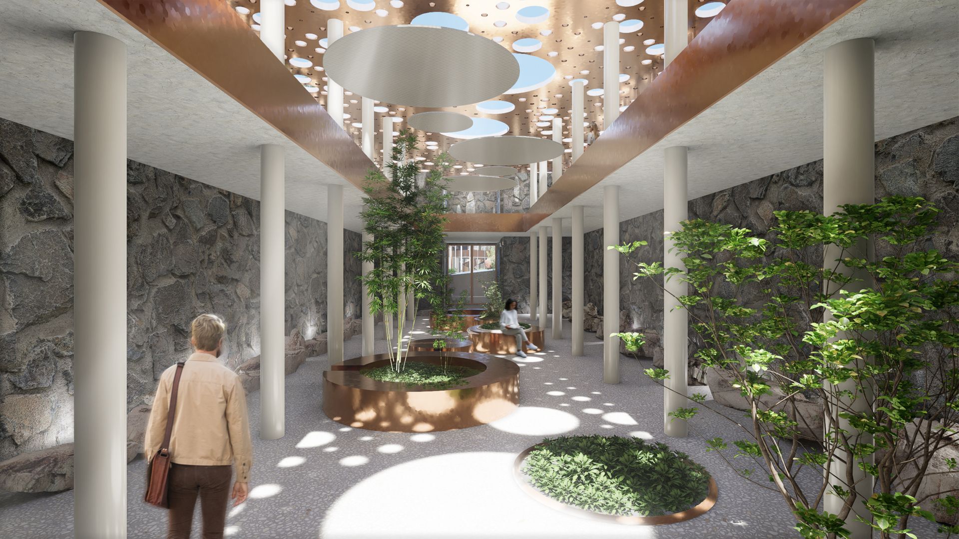 Objekat materijalizovan od recikliranog betona i CLT-a osmišljen je sa idejom da kao tvrdi štit čuva senzitivni sadržaj koji se nalazi unutar kompleksa.