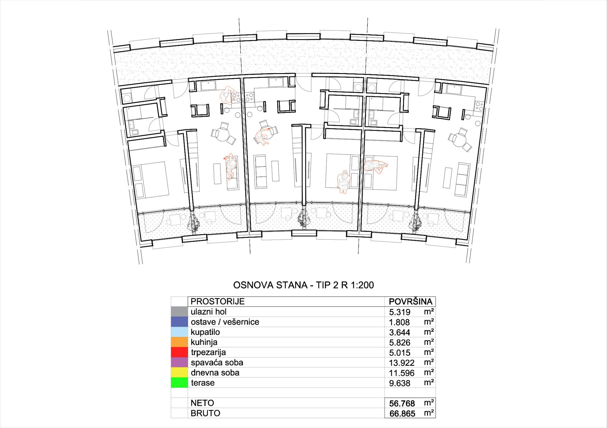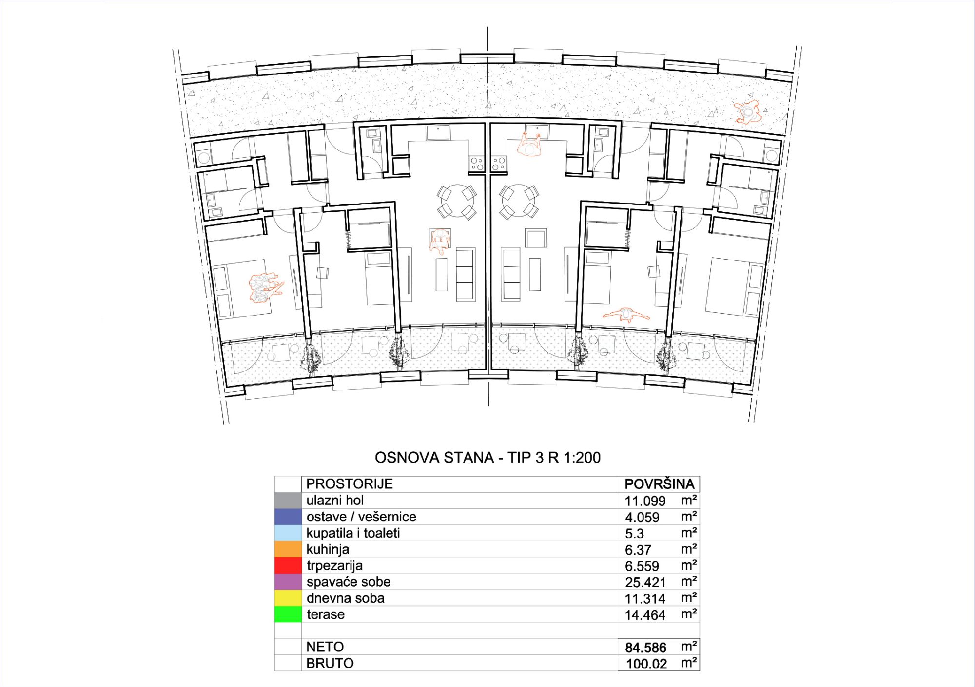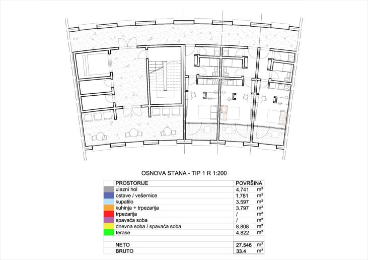 Konkursom traženo, od stanovanja, 20% su garsonjere, 50% dvosobni i 30% trosobni stanovi. Stanovi sadrže dnevnu i noćnu zonu, kuhinju, kupatilo i ostavu.