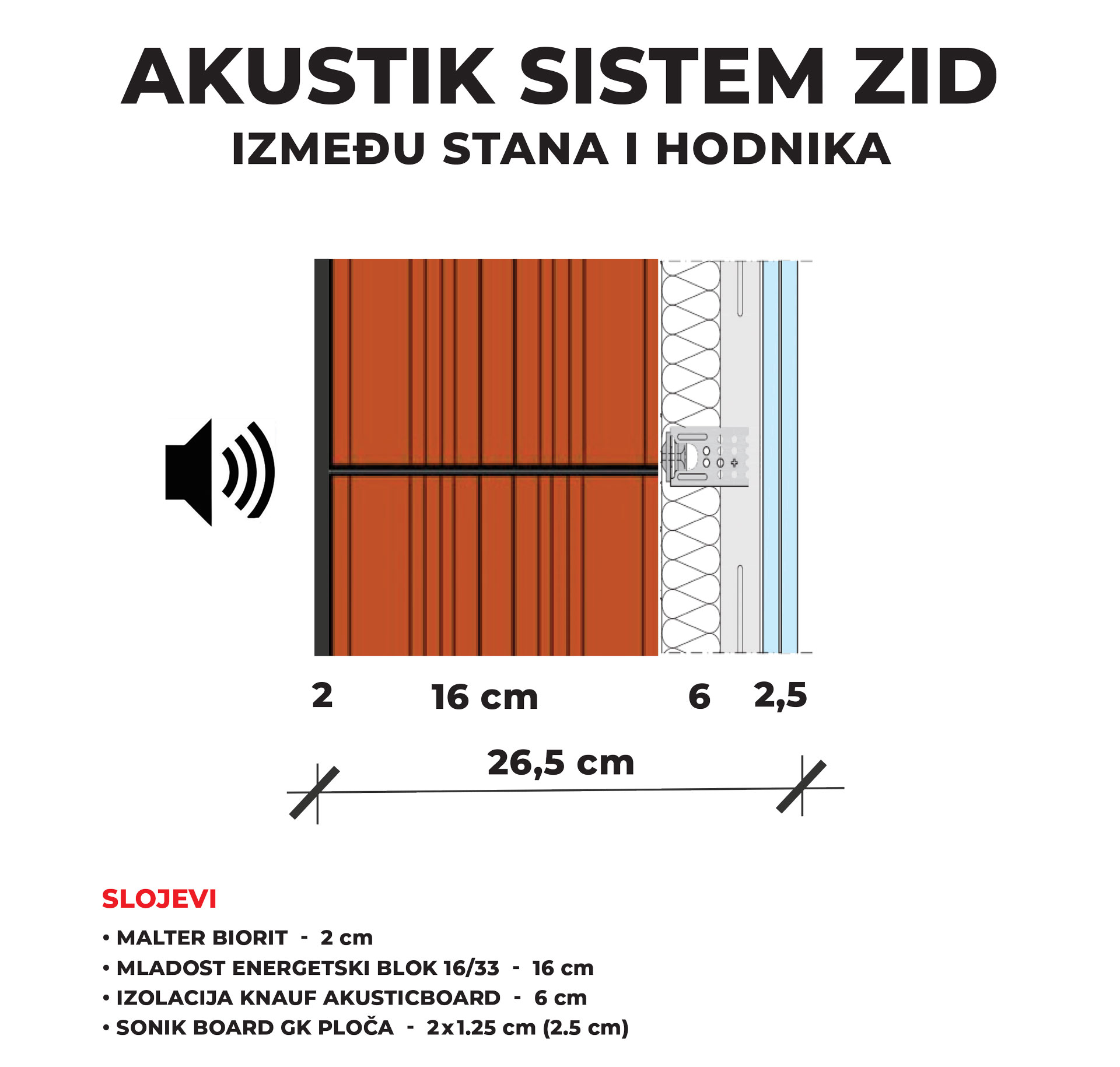 Akustik sistem zid između dva stana debljine je svega 23 cm, a postiže zvučnu izolaciju od 64 decibela. Ovakav zid se sastoji od Sonik ploče, Knauf Akustik ploče – staklene vune sa potkonstrukcijom kao i bloka Mladost EB 16/33 ili EB 10/33.