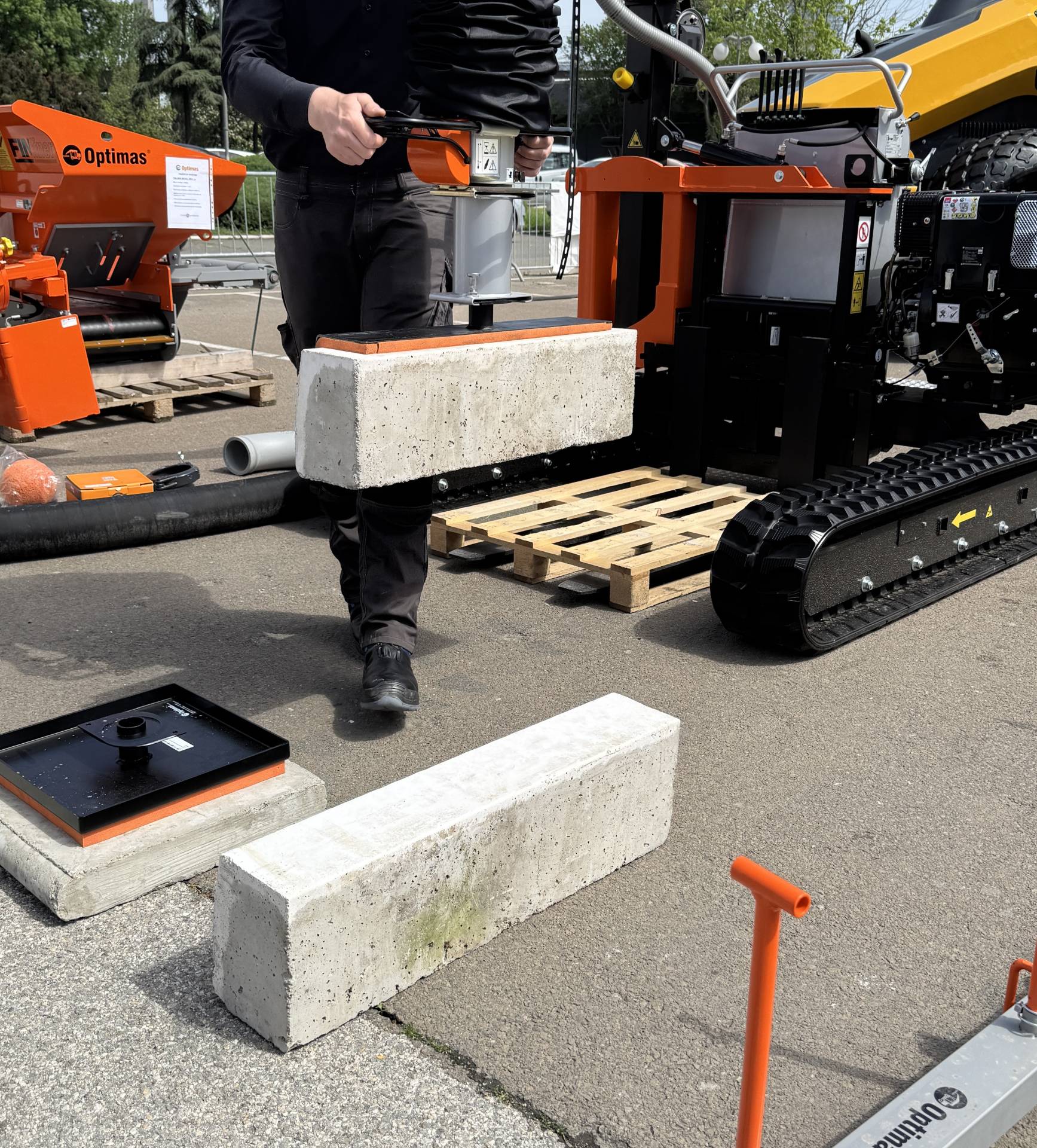 Na istom štandu videli smo i zanimljivu mašinu za postavku ivičnjaka. Ručno vođena, ova mašina hvata pod vakumom ivičnjake i slaže ih sa kapacitetom od 500 metara dnevno. Koliko je ovo brzo, svedoči podatak da je maksimalan kapacitet ručnim postavljanjem do 150 metara dnevno. Cena iznosi 57.000 + PDV.