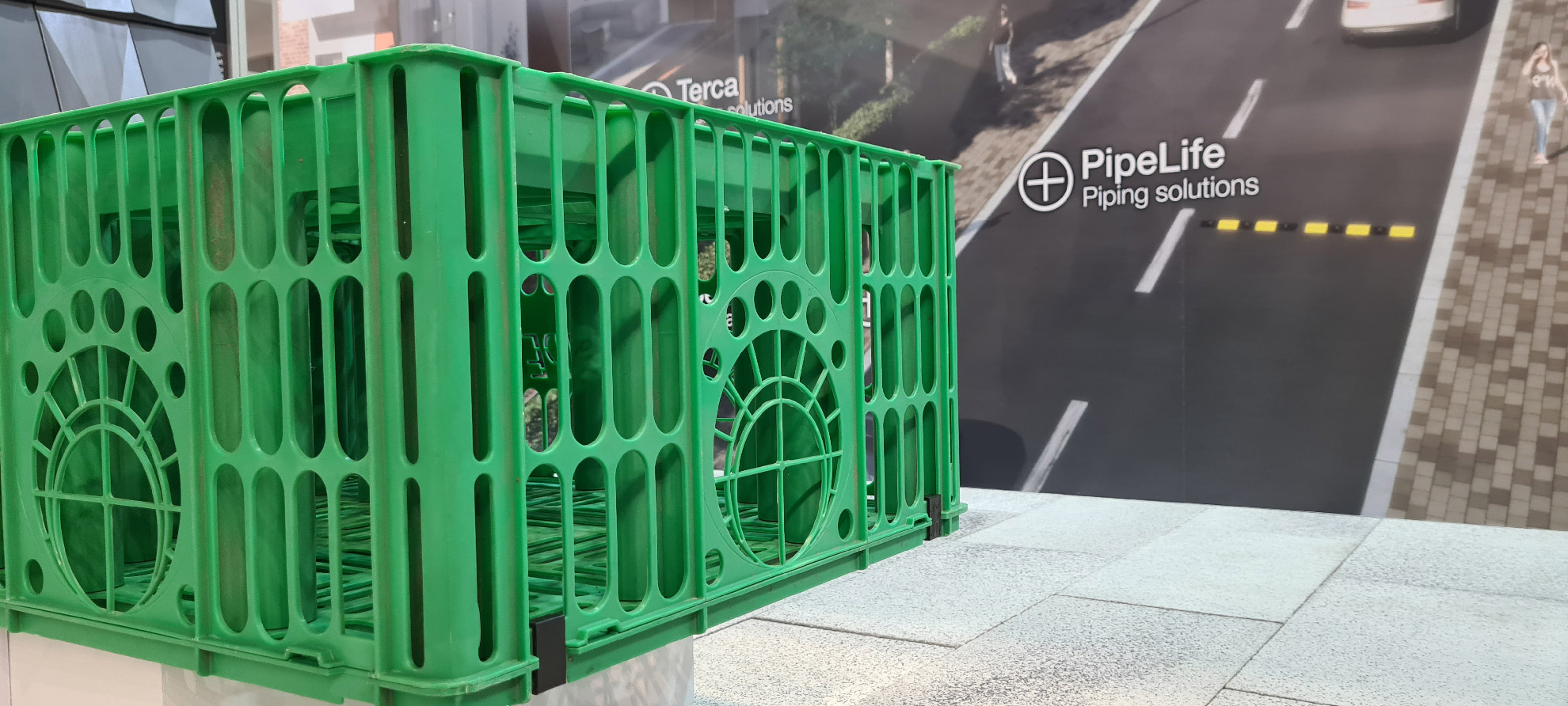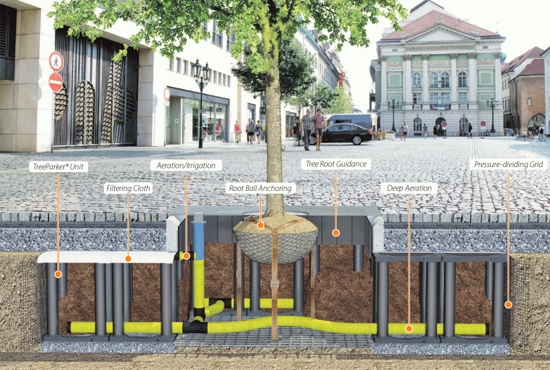 Ovaj sistem štiti korenje drveta od nabijanja prilikom postavke pešačkih ili kolskih podloga. Kako su nam rekli na štandu, drveće ce rasti veće i brže jer se korenje usmerava na dole uz pomoć barijere koja se postavlja oko korenja.