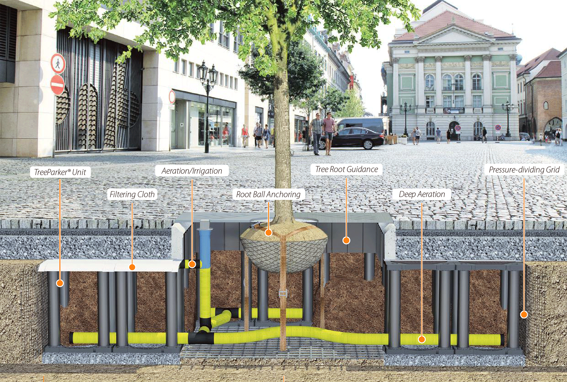 Takođe, korenju se dovodi vazduh i atmosferska voda specijalnim cevima koji se razvode u zemlji. Predviđa se i ankerisanje korenja dok je drvo tek posađeno, to jest mlado. Ovo je potrebno da stablo bude učvršćeno dok korenje drveta ne ojača.