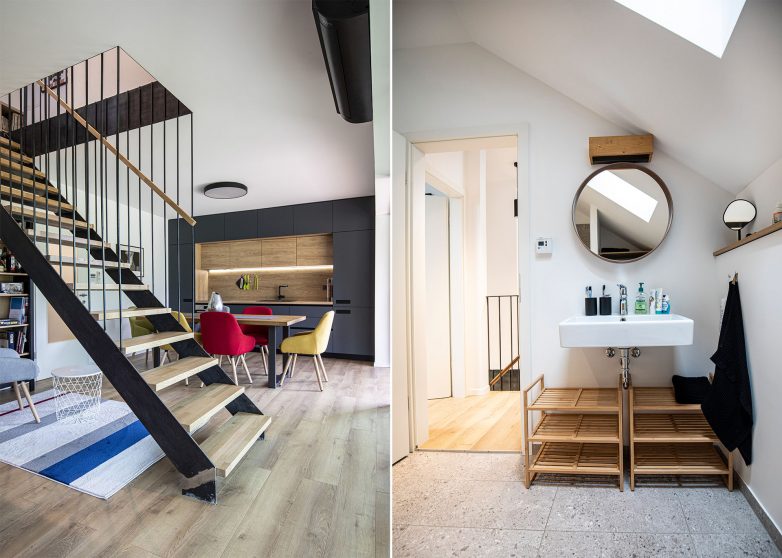 U proširenoj komunikaciji na spratu nalazi se dugačka polica s kolekcijom ploča i DJ pultom. „Kuća je ispunjena i odličnim fotografijama, kao što su na primer ona Džonija Štulića od našeg kultnog fotografa Ivana Posavca ili fotografija kamenica u Stonu snimljena iz vazduha Davora Rostuhara. U dnevnom boravku ima raznog nameštaja, od onog koji u ponudi ima IKEA, do custome-made stola uz kuhinju i lampe Mikelić Vreš“ – zaključuju autori.