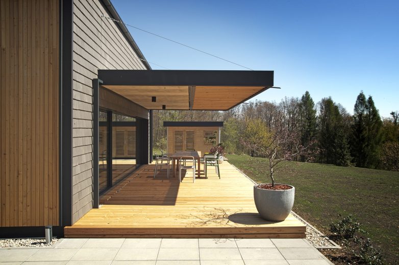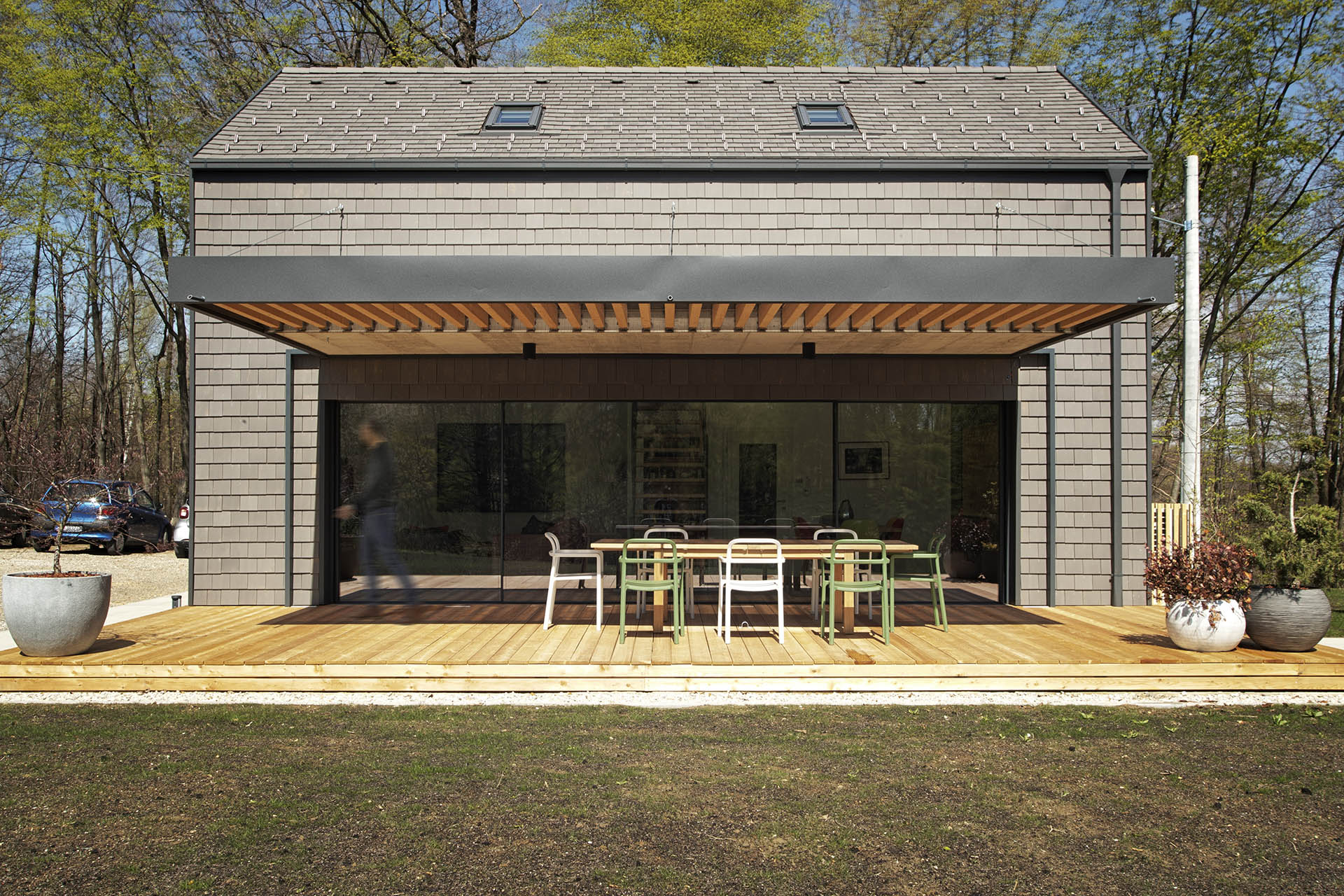 „U početnim fazama projektovanja razmišljali smo i o ravnom krovu, ali na kraju smo se ipak odlučili za kosi krov, karakterističan za podneblje u kojem se kuća nalazi“ – prisećaju se projektanti. Zabatne zidove arhitekte su obložili sibirskim arišom, dok su krov i podužne fasade tretirali biber crepom.