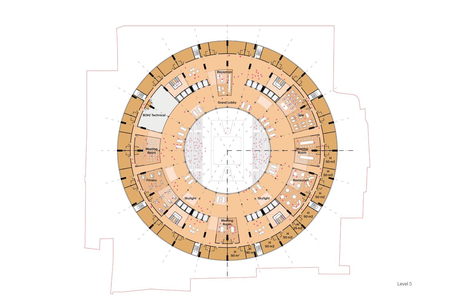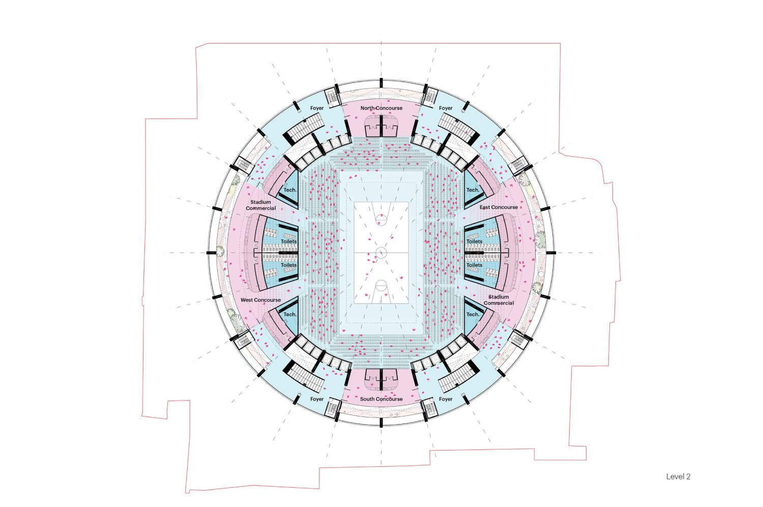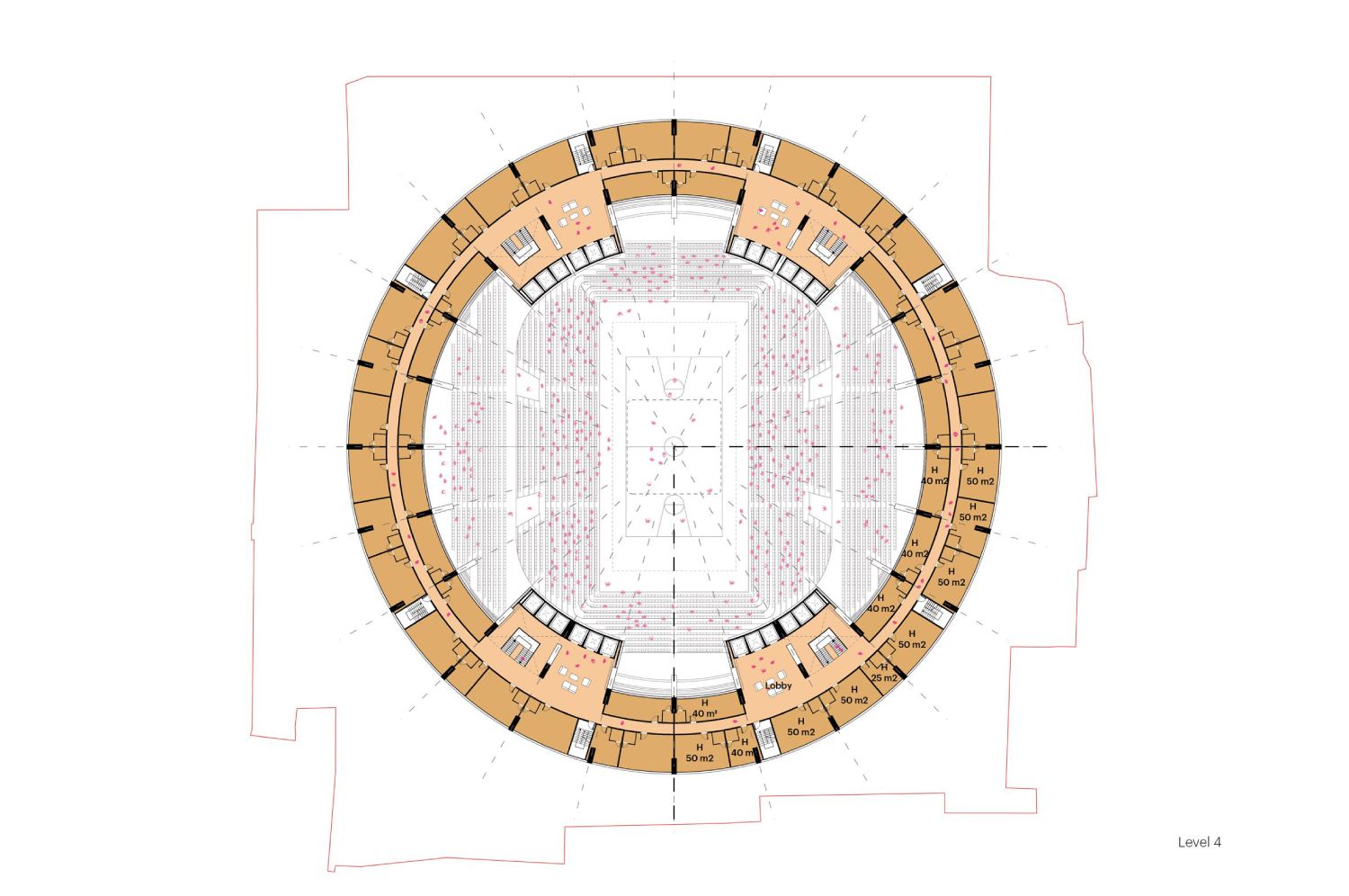 Sama sfera je pri dnu odsečena kako bi se otvorio prostor za javne trgove, sportske sadržaje i prsten maloprodajnih lokala u kontaktu sa ulicom. U prizemlju, niz stepenica vodi do više ulaza raspoređenih oko celog volumena; svi se ulivaju u kružni hol okružen trening salama i javnim sadržajima.
