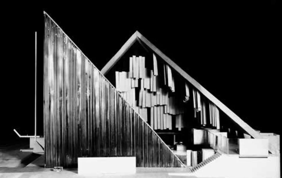 Pešićev pobednički koncept predložio je zgrade formiranu od sedam modularnih prizmatičnih oblika, naizmeničnih orijentacija, koji su svi svojim širokim stranama bili povezani u jedan dugačak kontinuirani izložbeni prostor.