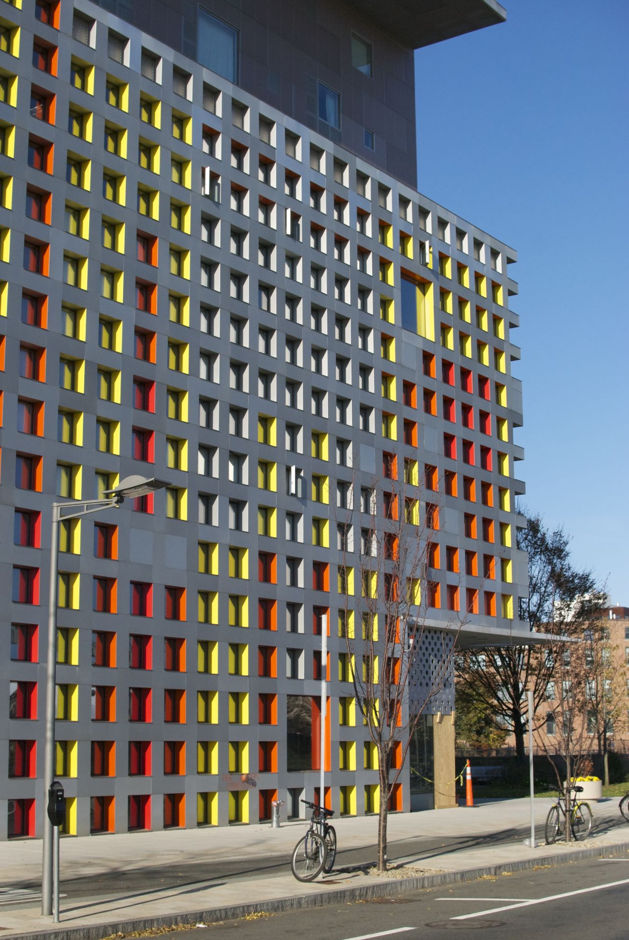 Otvori duž fasade približno odgovaraju ulazima, i dele zgradu na više blokova kako bi se u prostor unela sunčeva svetlost i vazduh. Obložena je aluminijumskim panelima, a ima šarene prozorske dovratnike koji ističu visoko postavljenu fasadu.