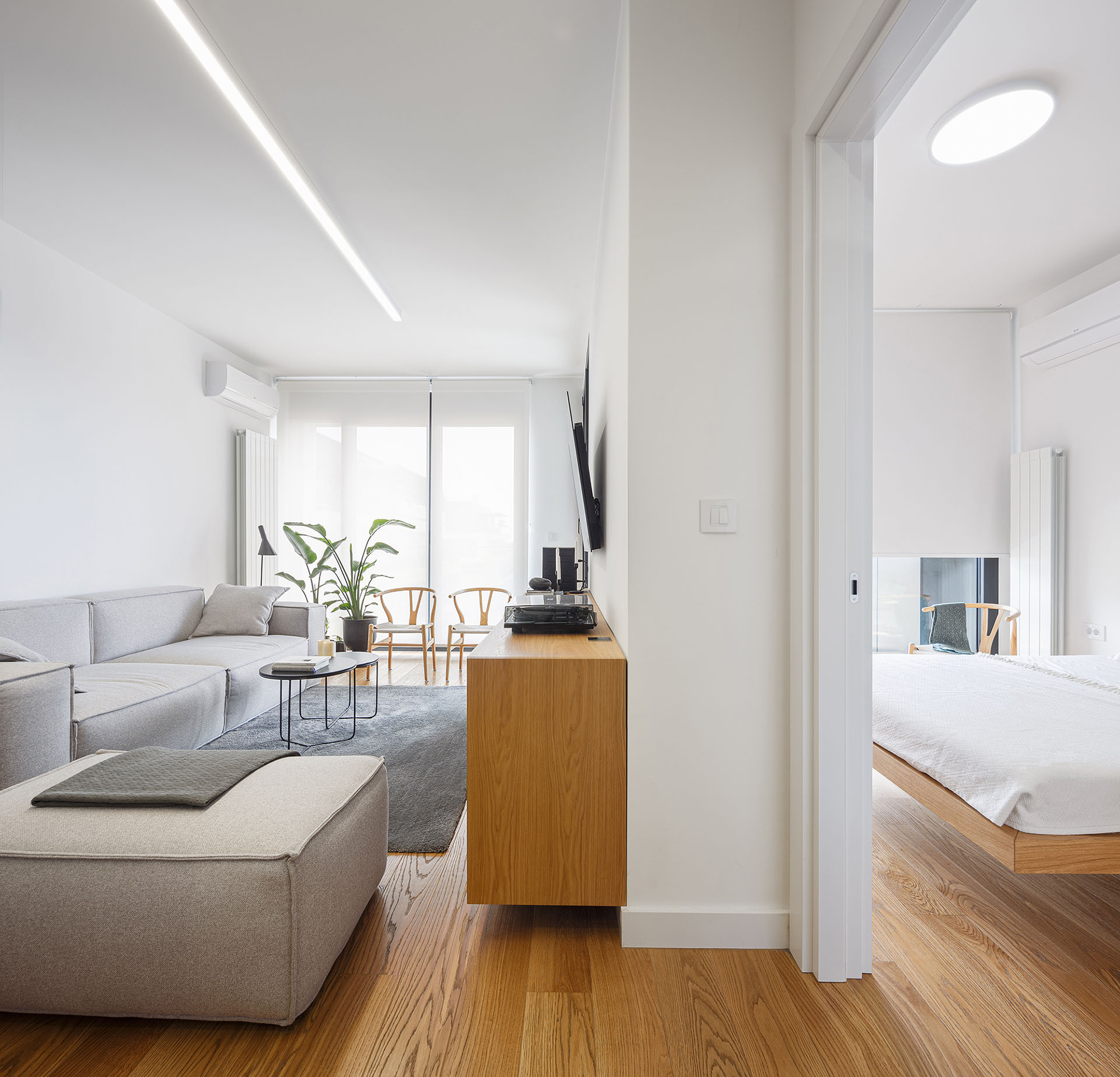 Pozicijom šanka, dizajniran je prekid u funkcionalnim zonama dnevne sobe i kuhinje, dok je istovremeno omogućen vizuelni kontinuitet do kraja stana.