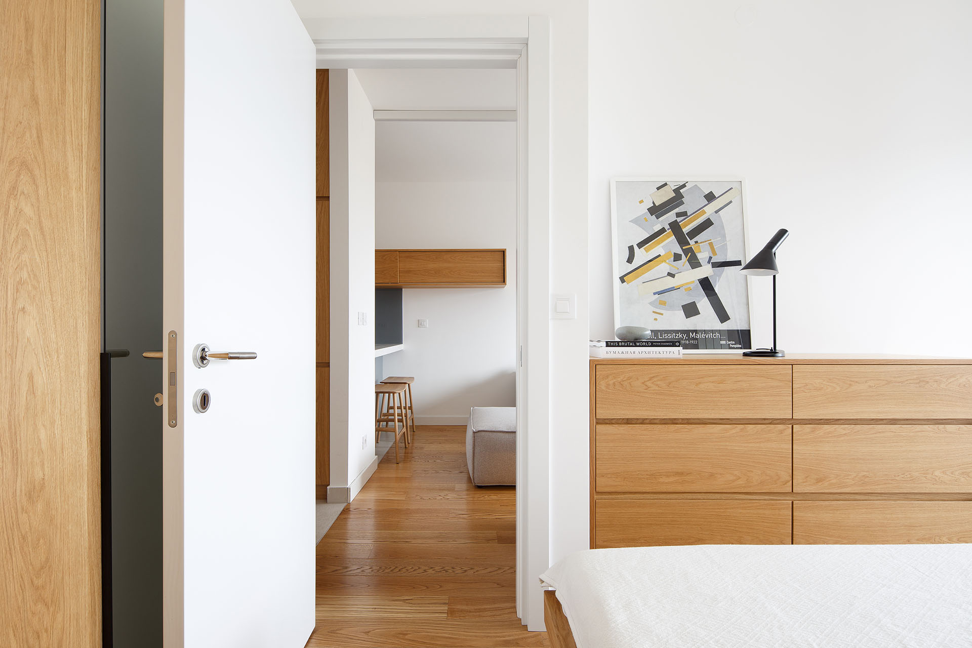 „Isti vizuelni jezik zastupljen je u kuhinji, u kojoj su gornji elementi tretirani kao zidne površine – belom bojom, dok donji elementi nastavljaju vizuelni ključ prostora za odlaganje iz ostatka stana – u toplim drvenim tonovima“ – navodi arhitekta.