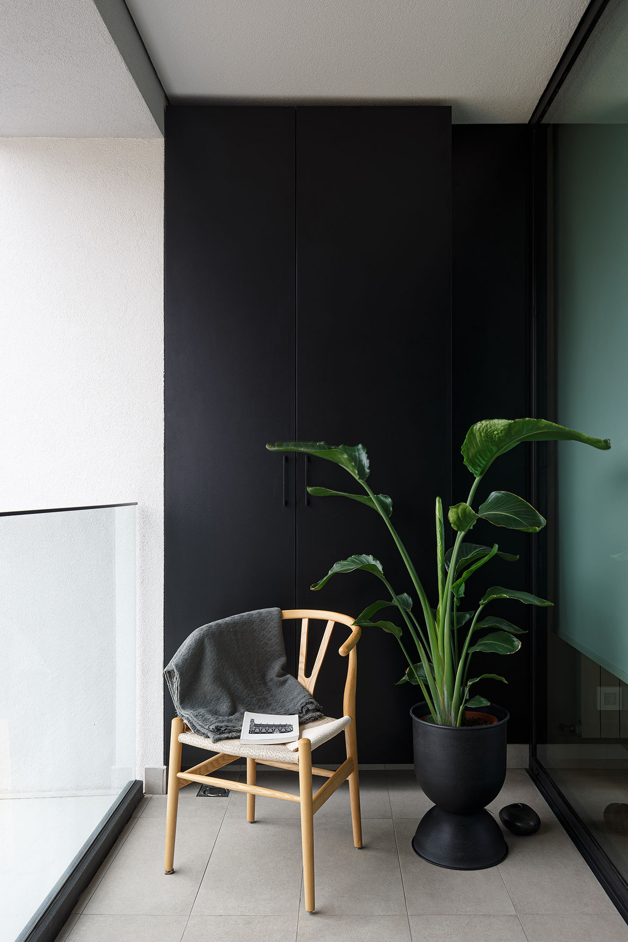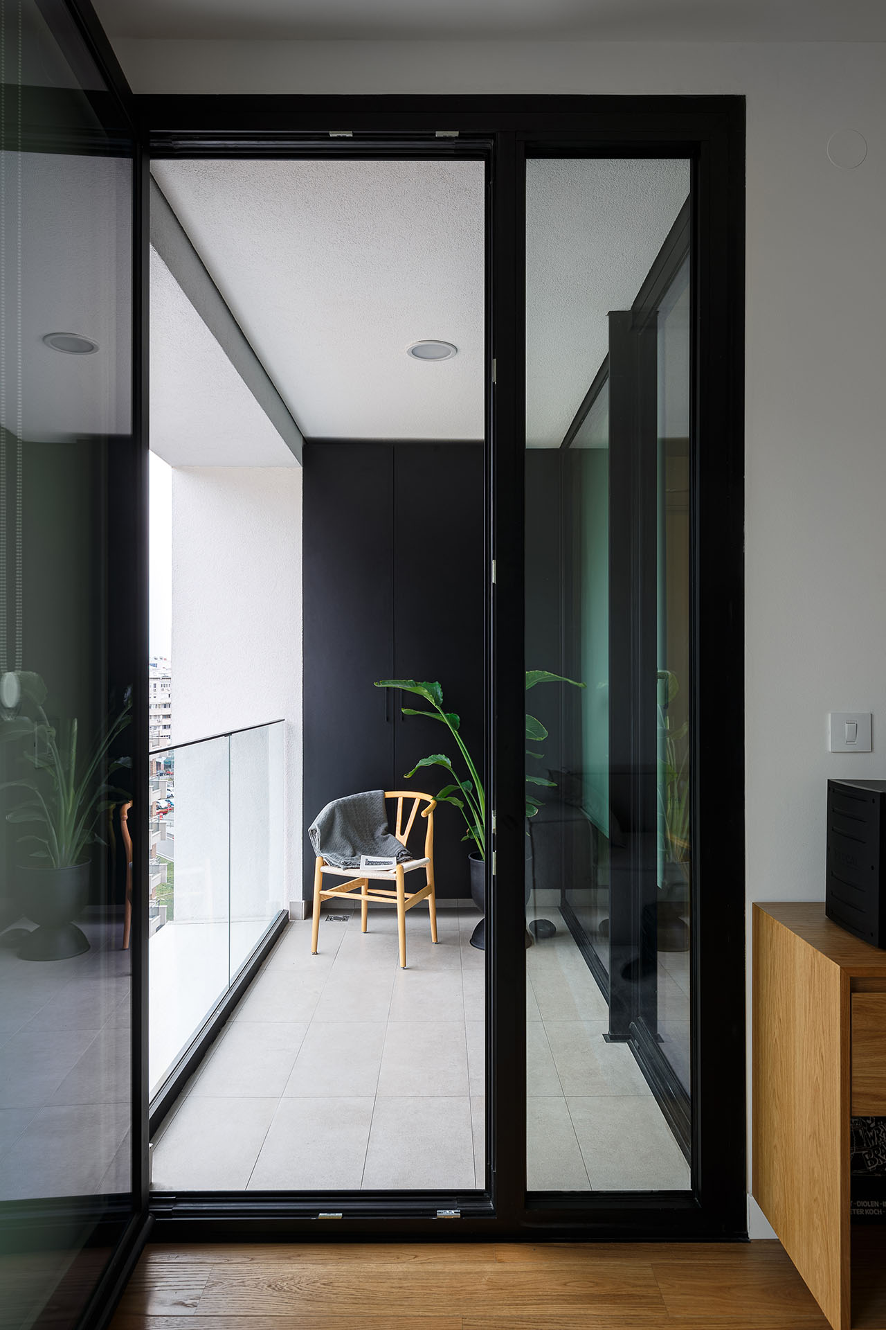 Definisanjem lođe kao tamne zone naglašenom upotrebom crne boje, i ponavljanjem komada nameštaja iz enterijera, ambijenti stana, kao i kretanje kroz njega postaju uravnoteženi i zaokruženi.