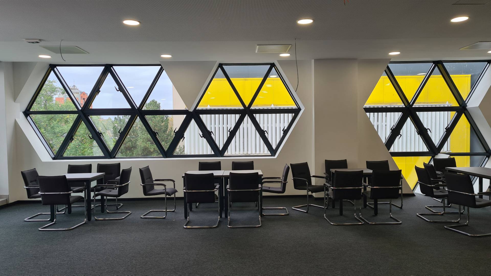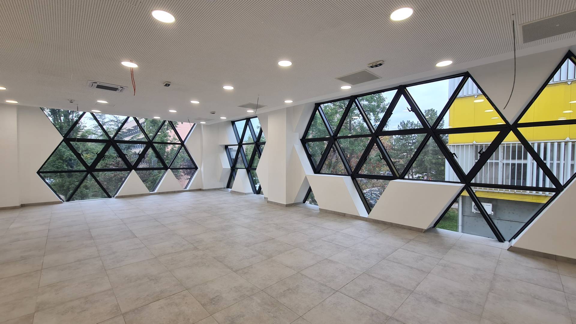 Osim crne muzičke kocke, SKC se može pohvaliti sa dva galerijska prostora koja su dinamiku dobila zahvaljujući trouglastim prozorima koji prate trougaonu šaru na fasadi od fibercementnih ploča.