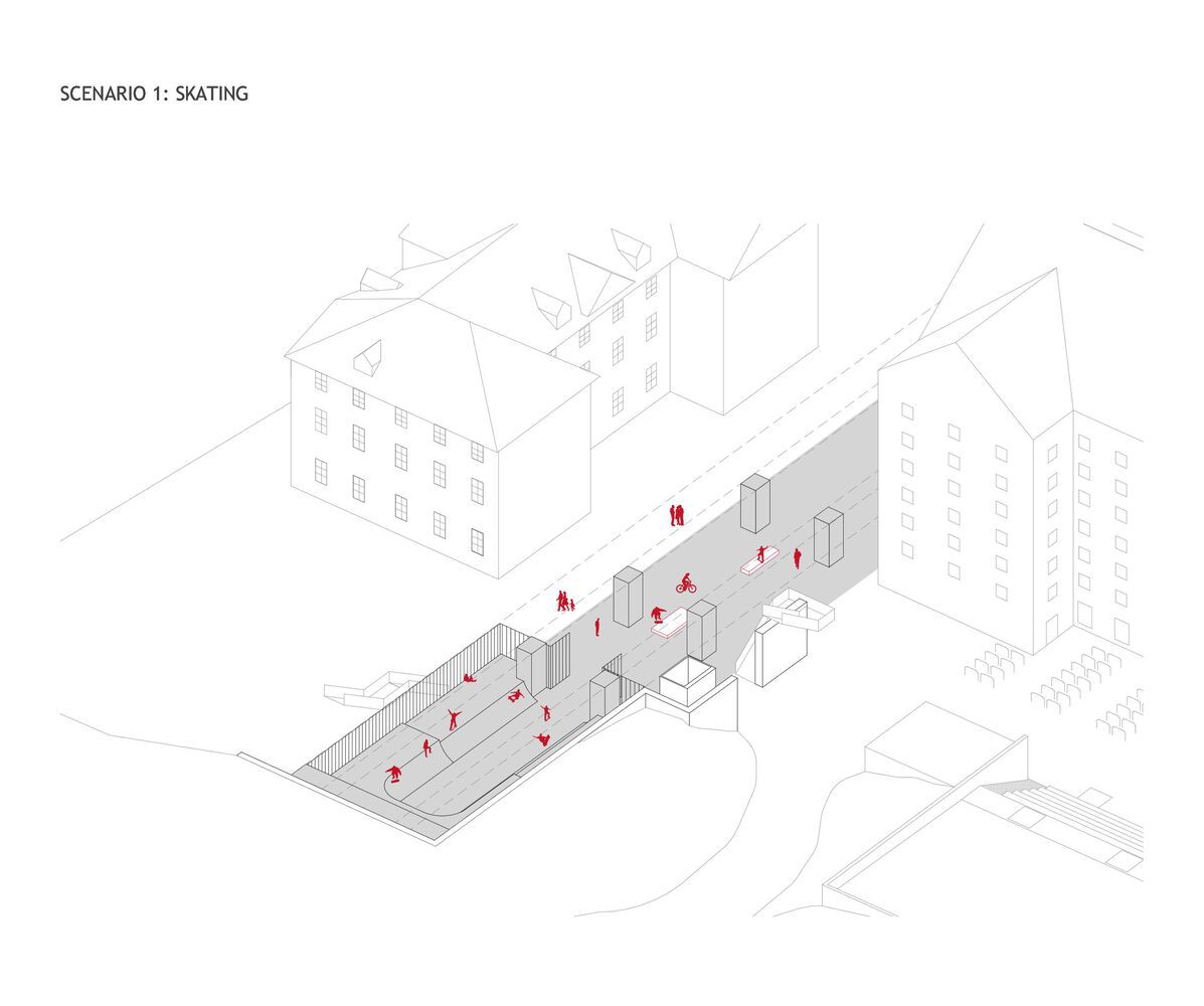 Projekat je osmišljen kao mini-rampa za skejtbord, koja zauzima neiskorišćeni džep prostora ispod južnog kraja mosta. Rampa je dizajnirana u saradnji sa skejterima i konsultantom za skejt parkove, s obzirom na to da su krivine i dimenzije rampe izuzetno specifične, objasnile su arhitekte.