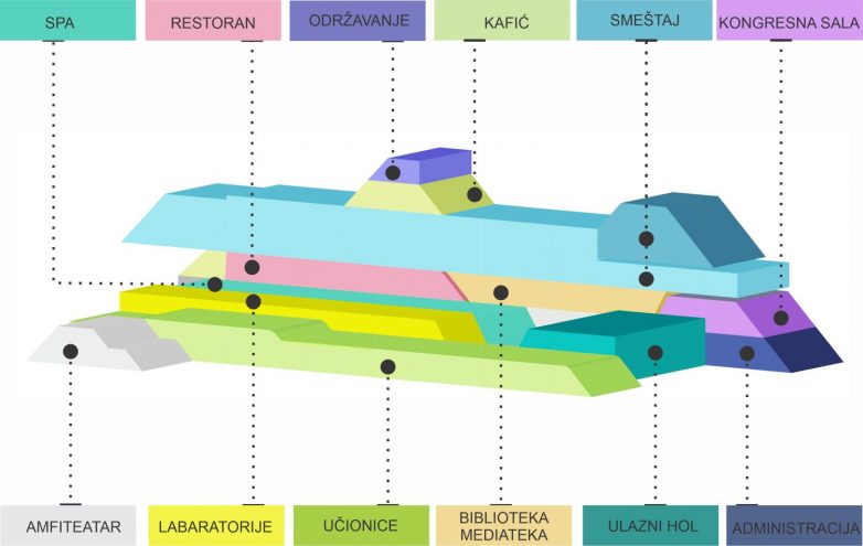 Centar izvrsnosti imaće 10 funkcionalnih zona: edukativnu zonu, administrativni deo, konferencijsku, smeštajnu i restoransku zonu, tehničko-ekonomski deo, sportsko-rekreativnu i zabavno-rekreativnu zonu, parking prostor i zelenilo.