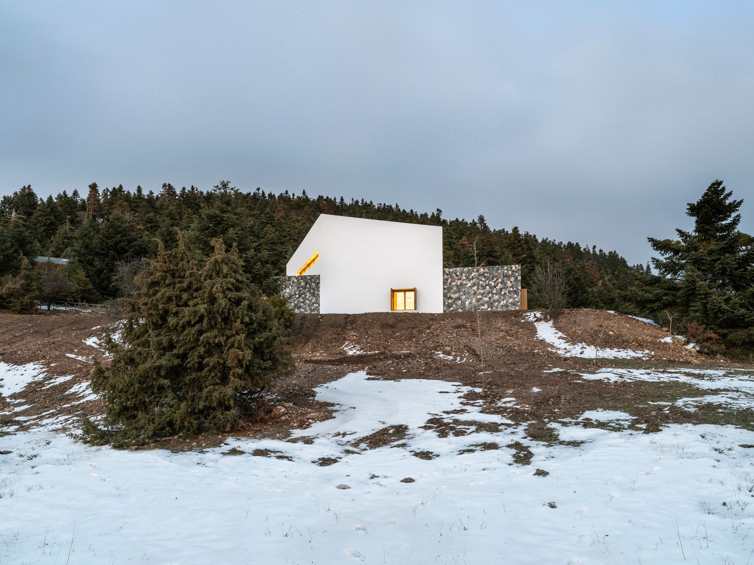 Na kamenoj bazi kreiran je beli volumen koji podseća na velike snežne nanose karakteristične za ovu planinu na Peleponezu.