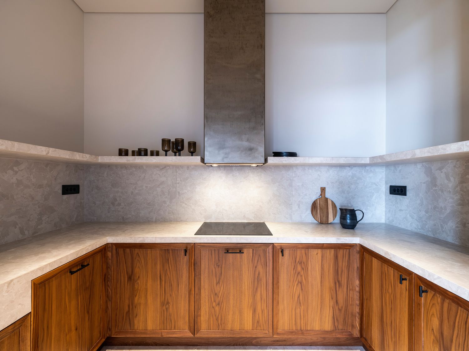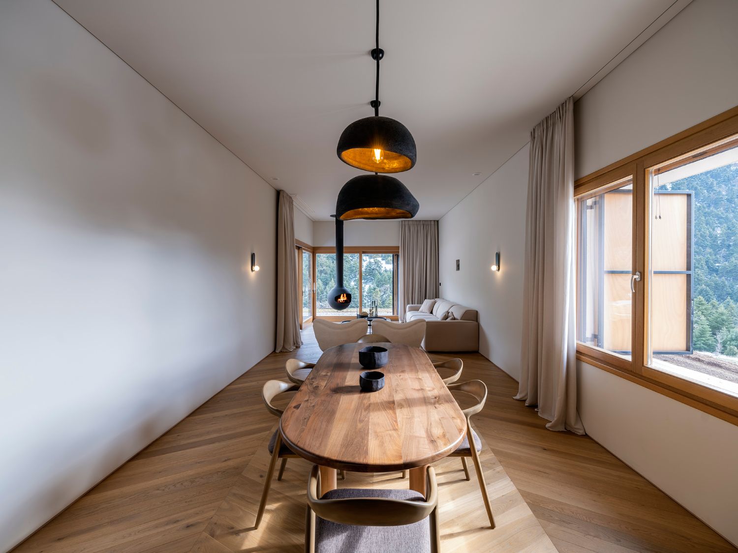 Unutrašnjošću kuće dominiraju suptilan i bezvremenski dizajn, zemljani tonovi, drveni podovi i nameštaj, kao i veliki fasadni otvori koji omogućavaju da prirodna svetlost, boje i materijali iz okruženja prodru i u unutrašnjost kuće.