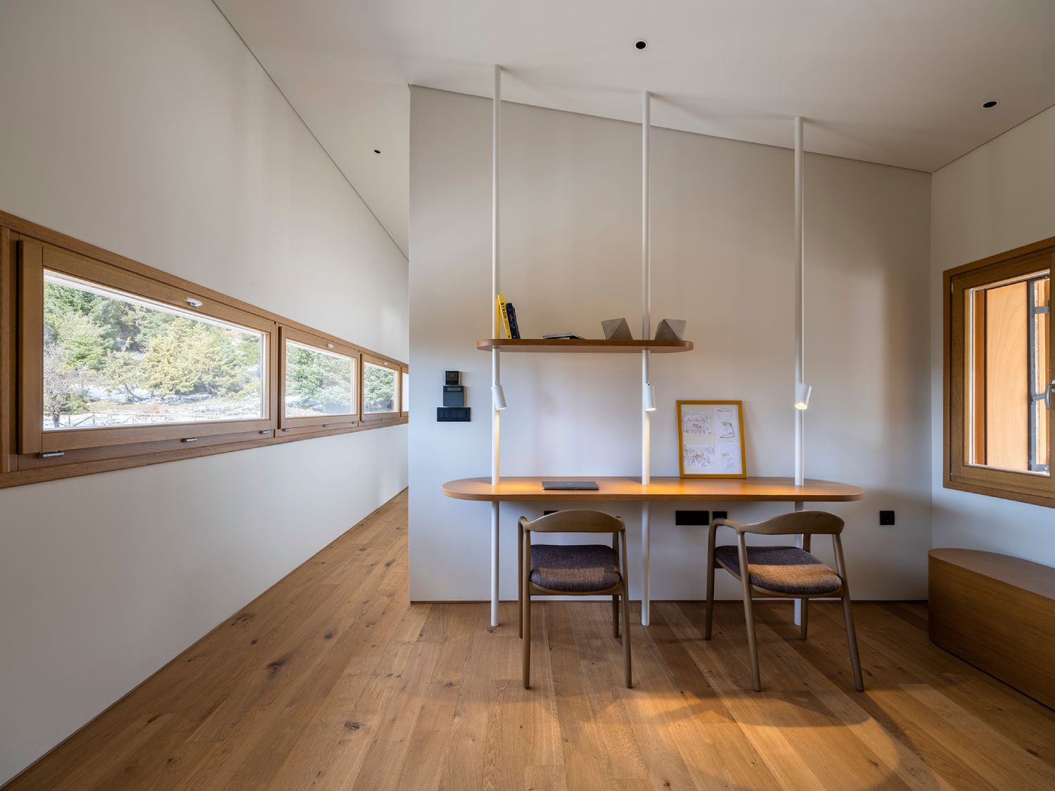Glavna kuća, koja se sastoji od linearnog volumena, sadrži zajednički prostor porodice i master spavaću sobu.