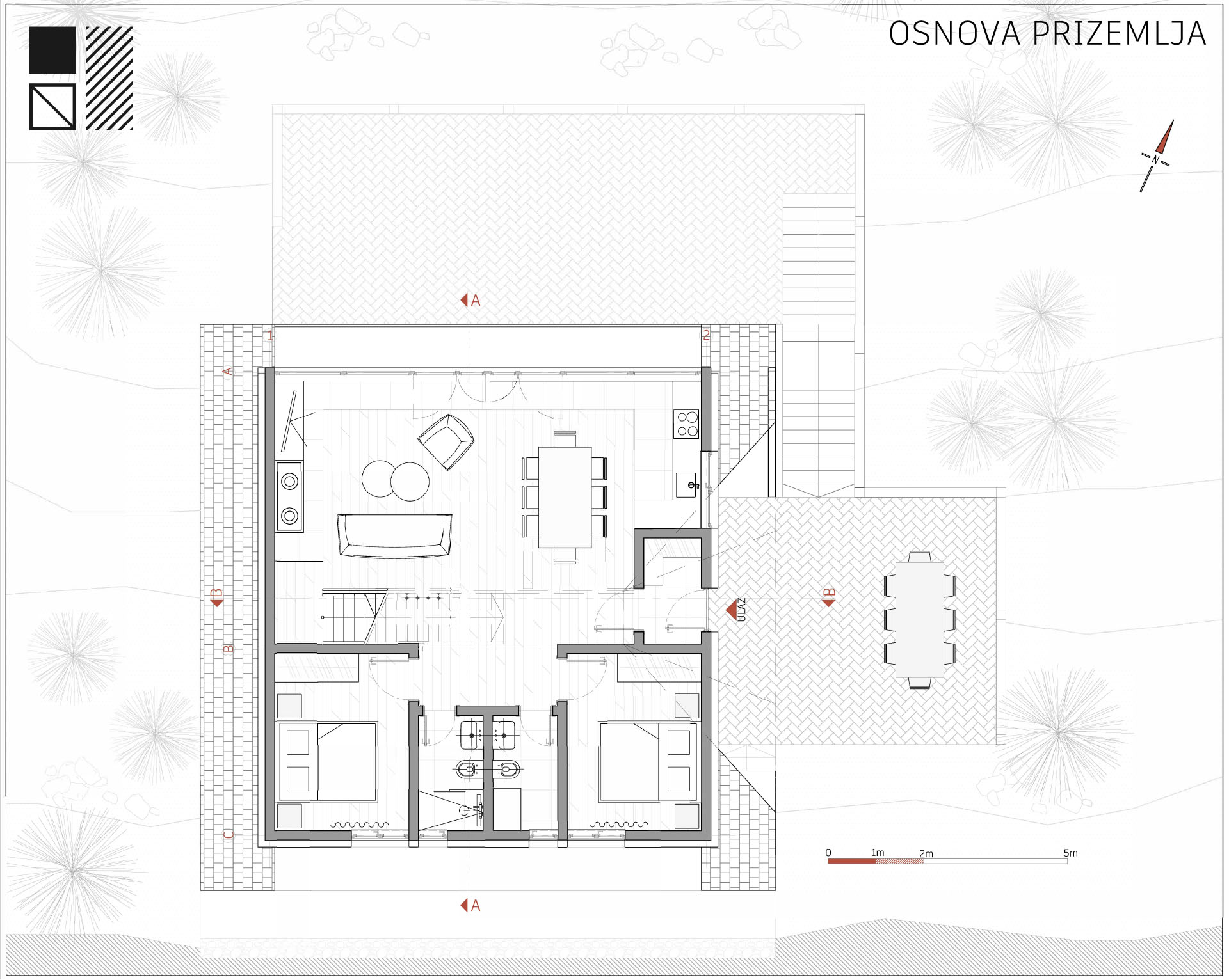 Samim tim, objekat je podeljen po horizontali na dve odvojene jedinice koje su povezane vertikalnom komunikacijom. Tako u prizemlju imamo opciju potpuno nezavisne jedinice, koju po strukturi čini veliki dnevni boravak sa integrisanom kuhinjom i trpezarijom, kupatilom i master spavaćom sobom.