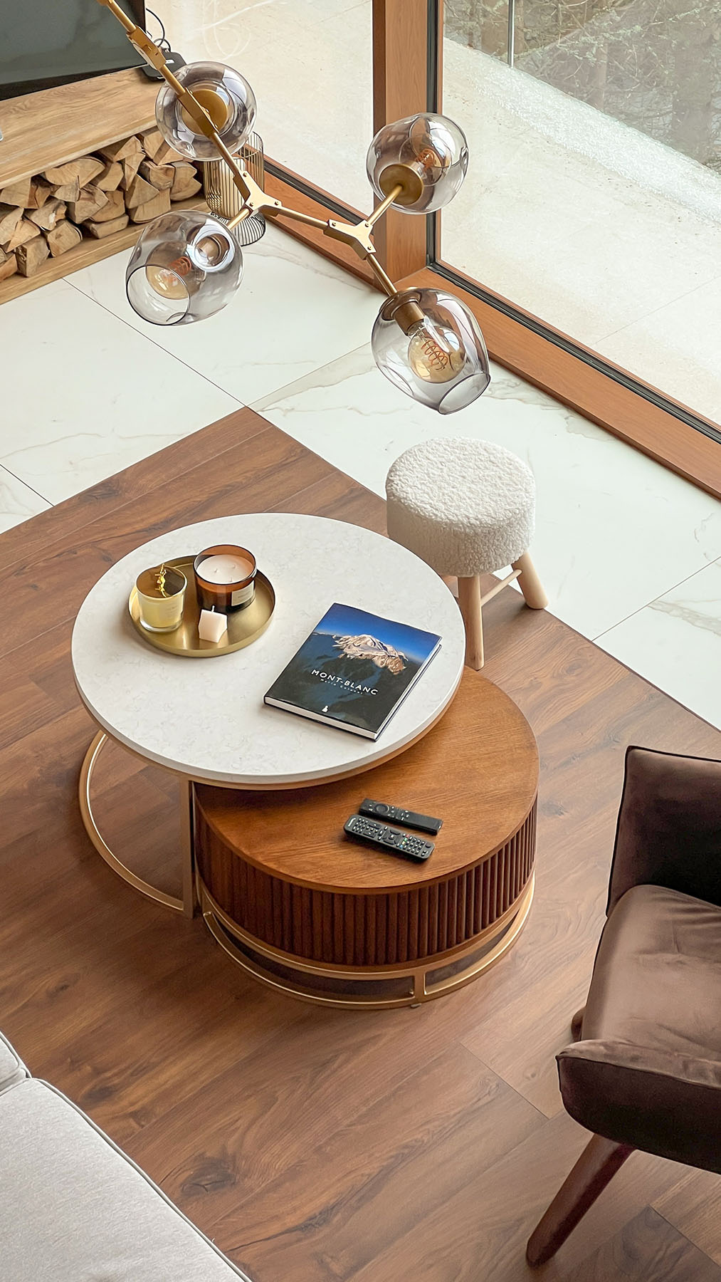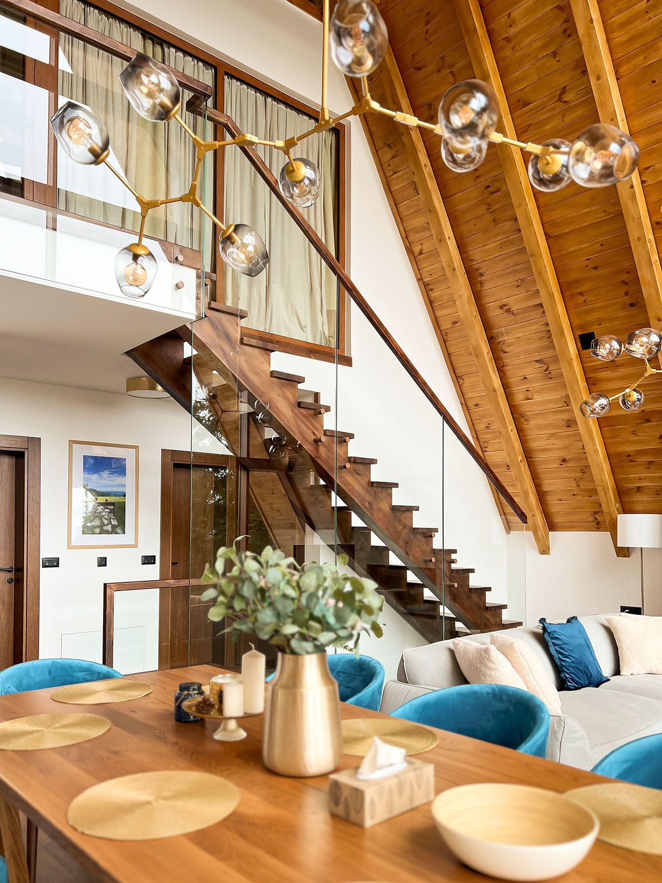 „Ukratko, glavni detalj enterijera su vizure na netaknutu prirodu. Međutim, upotrebom velike staklene površine bili smo na granici da ugrozimo ceo koncept i da na kraju pređemo granicu i objekat potpuno podredimo savremenom stilu. Kako bismo formirali idealan balans, oformili smo kamin kao dodatni centralni motiv dnevnog boravka i doneli zajedničku odluku sa klijentima da što više elemenata u prostoru budu u drvenom dekoru, kako bismo ublažili velik uticaj savremene gradnje“ – navode autori.