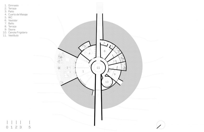 Van kružnog hodnika koji okružuje centralnu komoru nalaze se prostorije u kojima su smeštene zone za masažu, saunu i toalete, dok je teretana u prizemlju povezana sa terasom.