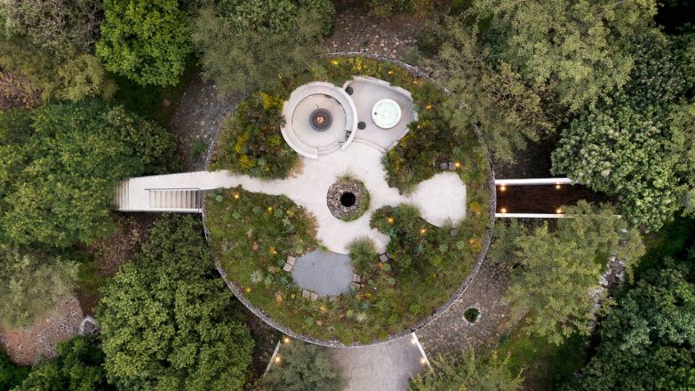 Konusna struktura sa ravnim zelenim krovom iznutra je obložena vulkanskim kamenjem, a u njoj su smešteni teretana, studio za masažu, sauna i hladni bazen.