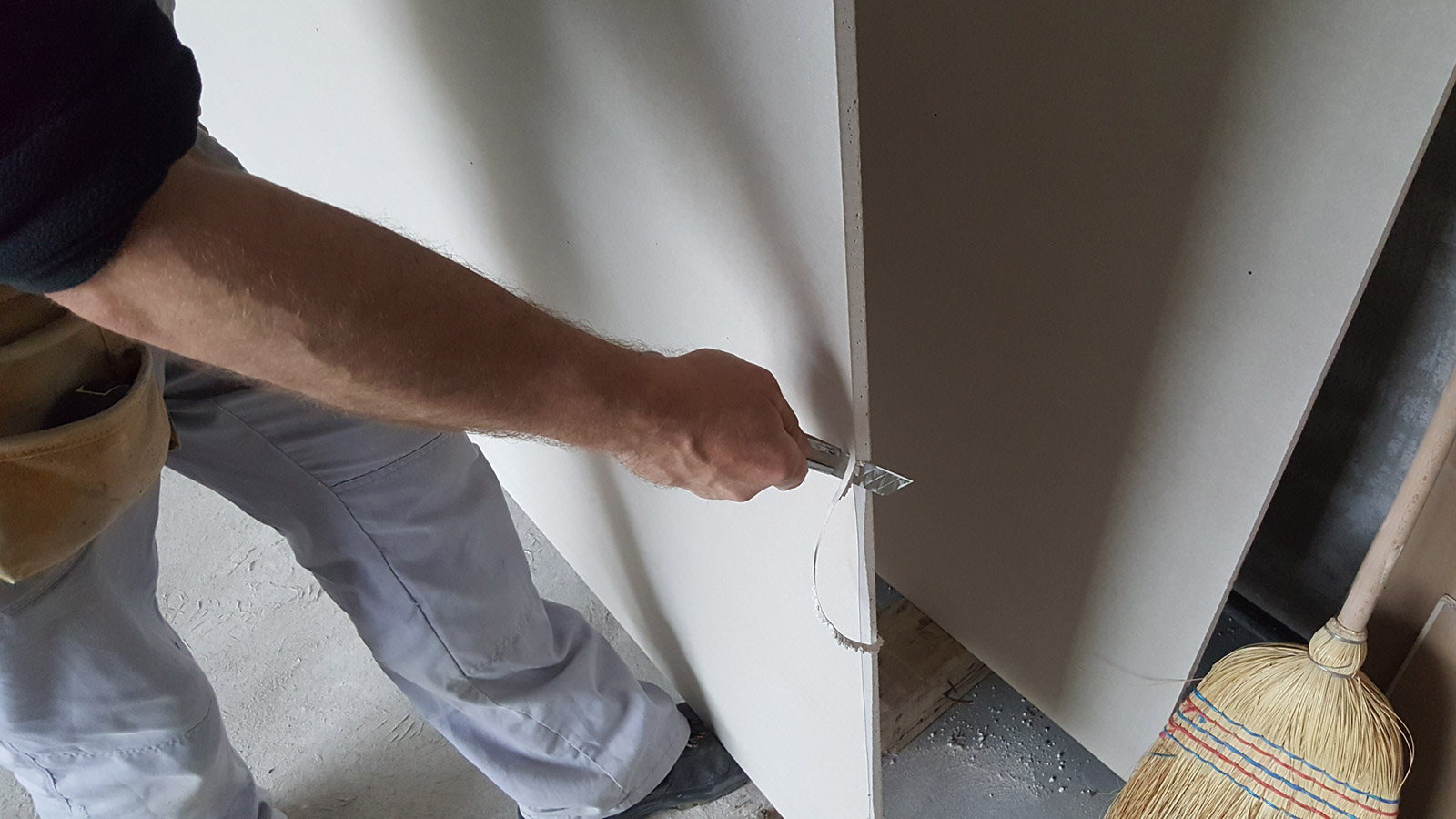 Zatim se na postavljenu konstrukciju montiraju gipskartonske ploče. Ploče su dimenzije 120×200 ili 120×260 cm i one se seku skalpelom na odgovarajuće dimenzije. Sa konstrukcijom se povezuju uz pomoć vijaka crne boje. Za jednu gipskartonsku ploču treba oko 30 vijaka jer se u jedan red stavlja oko 6 komada (6 komada u 5 redova = 30 vijaka). Bitno je da se gipsane ploče postavljaju unakrsno, to jest, da se izbegava postavka spoja ploče na spoj ploče. Ivice ploča ne treba da se nastavljaju kako bi se smanjile mogućnosti za pucanje ploča.