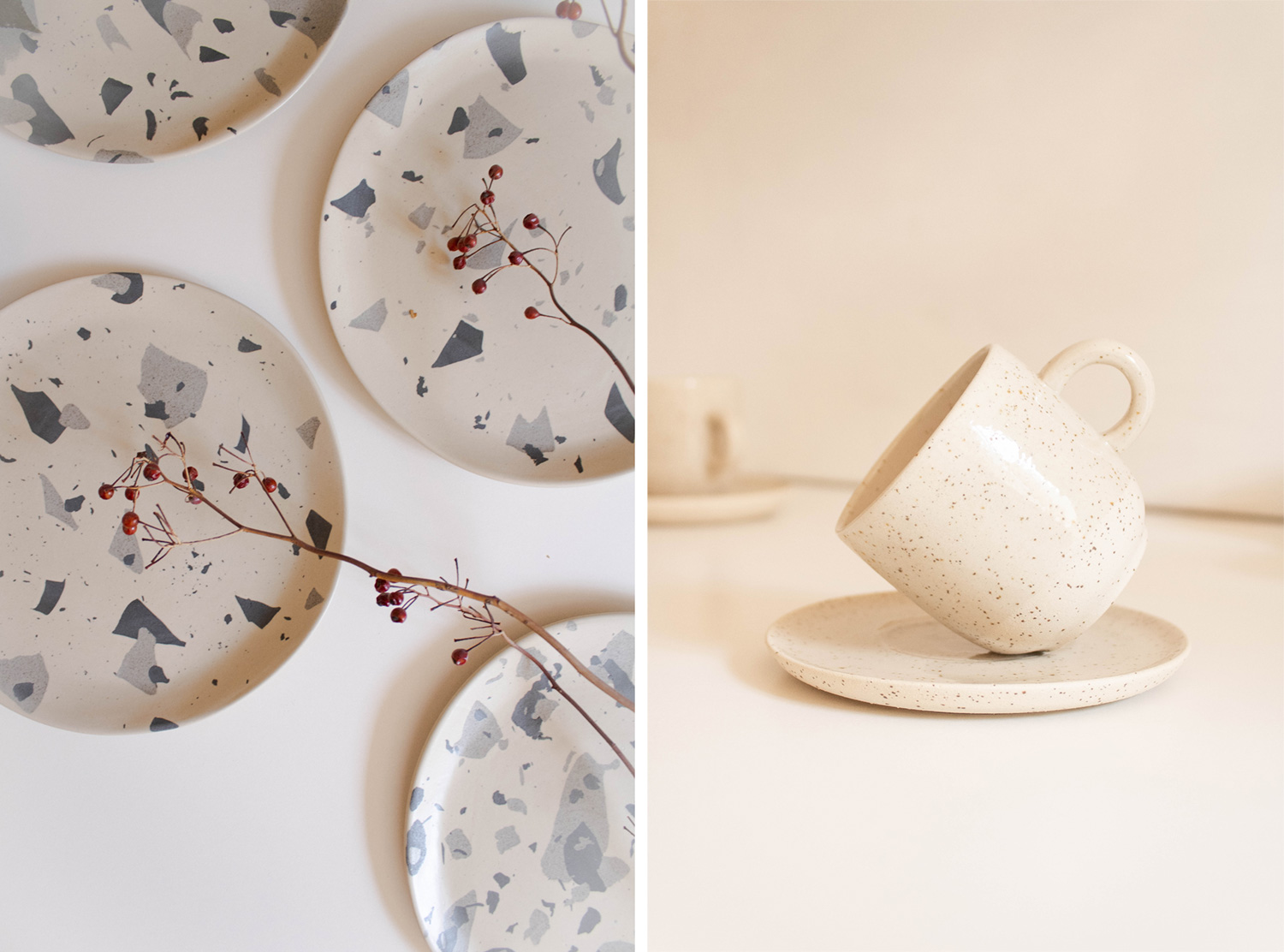 Kreativna Jelena Vučićević ručno pravi ove neodoljive tanjire i šoljice. Terrazzo tanjiri su napravljeni od gline tehnikom oblikovanja iz ploča i organskog su oblika. Prečnika su 23 cm, a u kombinaciji krem-beton siva-crna glina. Što je vrlo bitno, perivi su u mašini za pranje sudova.