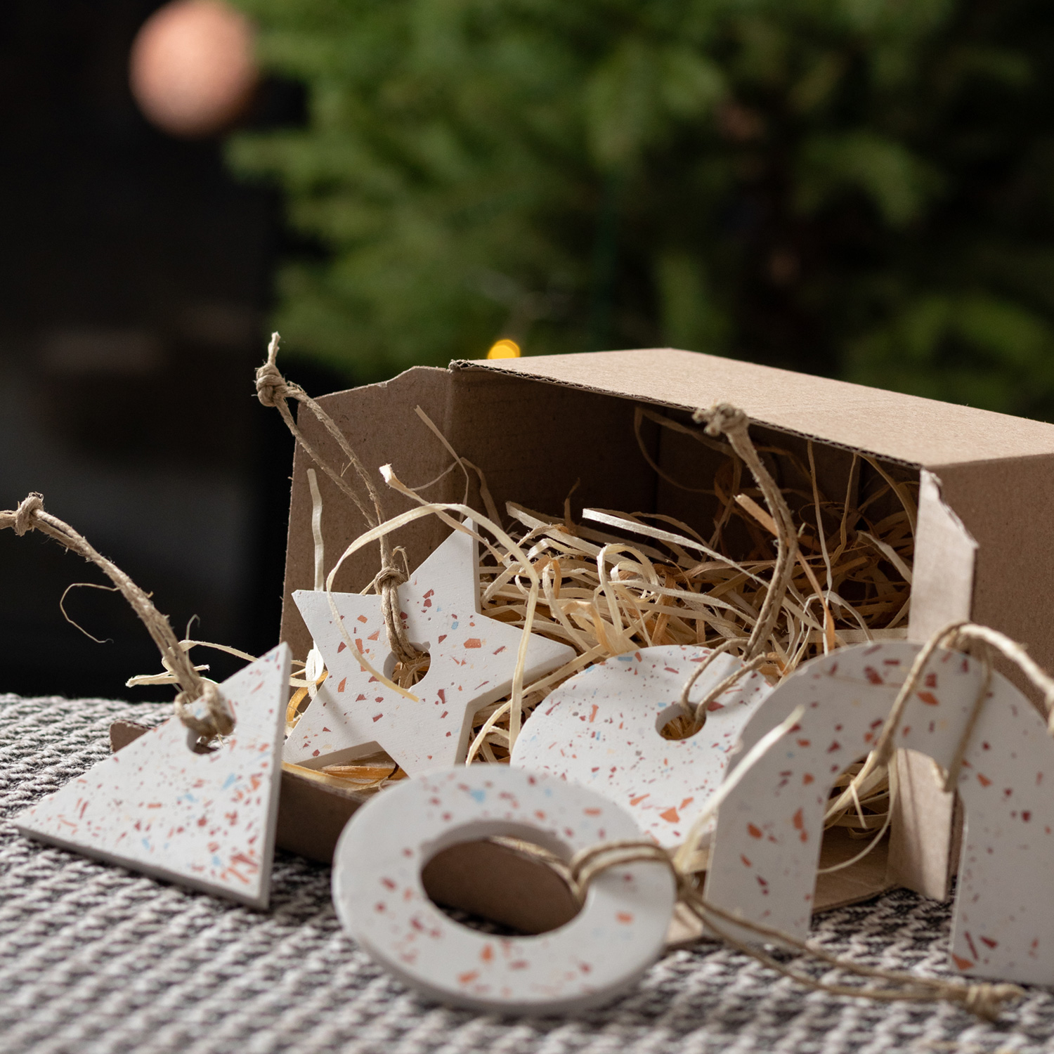 U ponudi su četiri kombinacije boja u terrazzo koloritu, u setovima od pet komada različitih oblika, upakovanih zasebno u kutijice. Ukrasi su veličine okvirno 5cm.