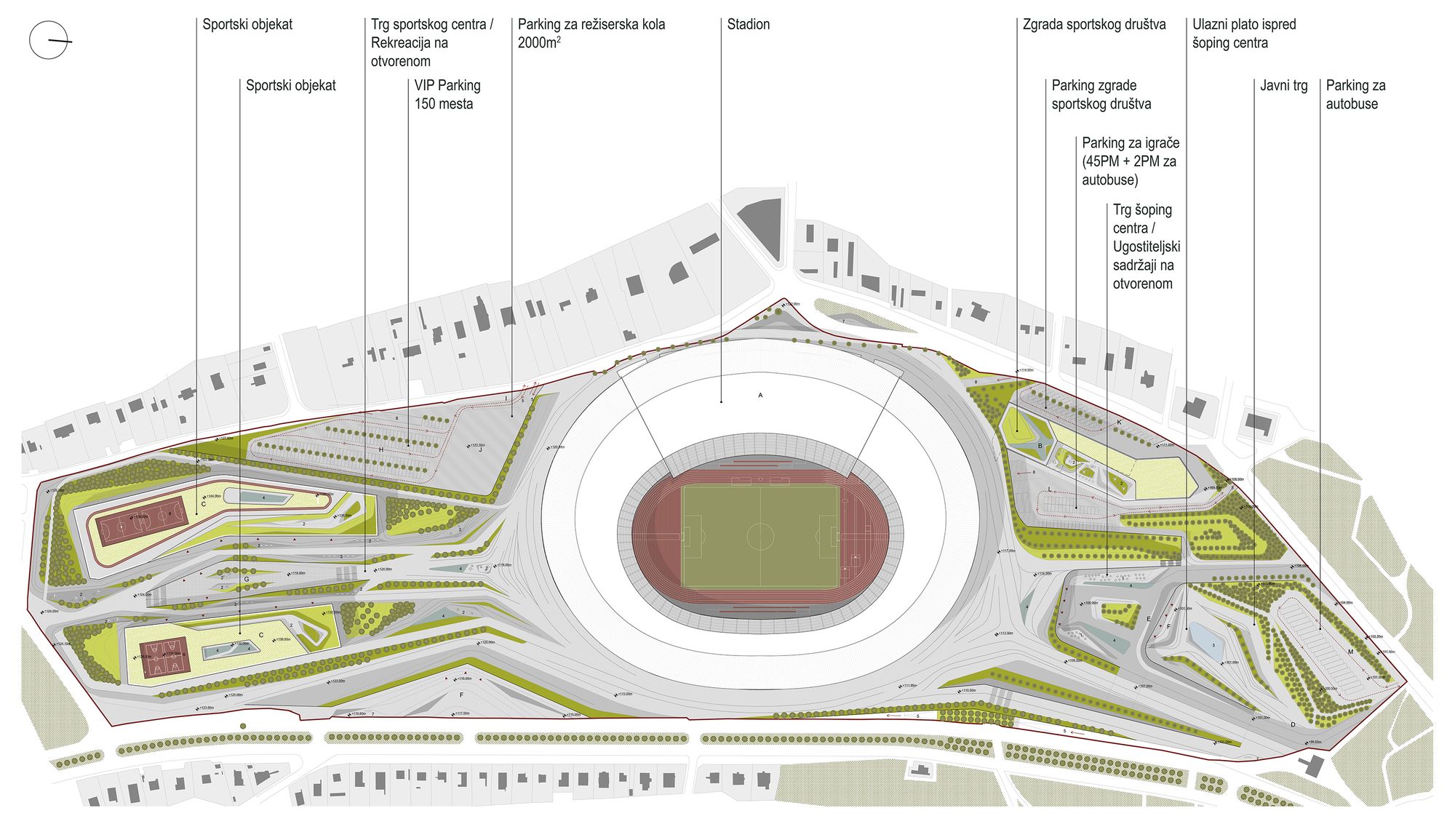 Koncept koji predlažu autori predviđa paralelno razvijanje stadiona s okruženjem kao jedinstvenog sportskog i komercijalnog sistema sa primarnim ciljem ojačavanja FK Crvene Zvezde kao brenda. Kičma ove zone je javna promenada koja povezuje severnu i južnu stranu područja, dok je centralna i atraktivna tačka master plana stadion – novi gradski reper. Master plan ove zone, pored stadiona, predviđa još i objekte sportskog sadržaja, šoping centre s lokalima za izdavanje, poslovne prostore u okviru rekonstruisane zgrade Sportskog društva, trgove i javne prostore za odmor i rekreaciju na otvorenom kao i parkinge povećanog kapaciteta. Primenom principa “landscape arhitekture” ostvarena je velika bruto razvijena građevinska površina izgrađene strukture uz veoma nizak indeks zauzetosti na parceli pri čemu je dobro iskorišćen i tržišni potencijal ove lokacije, ali i potencijal za pružanje kvalitetnih rekreativnih aktivnosti na otvorenom.