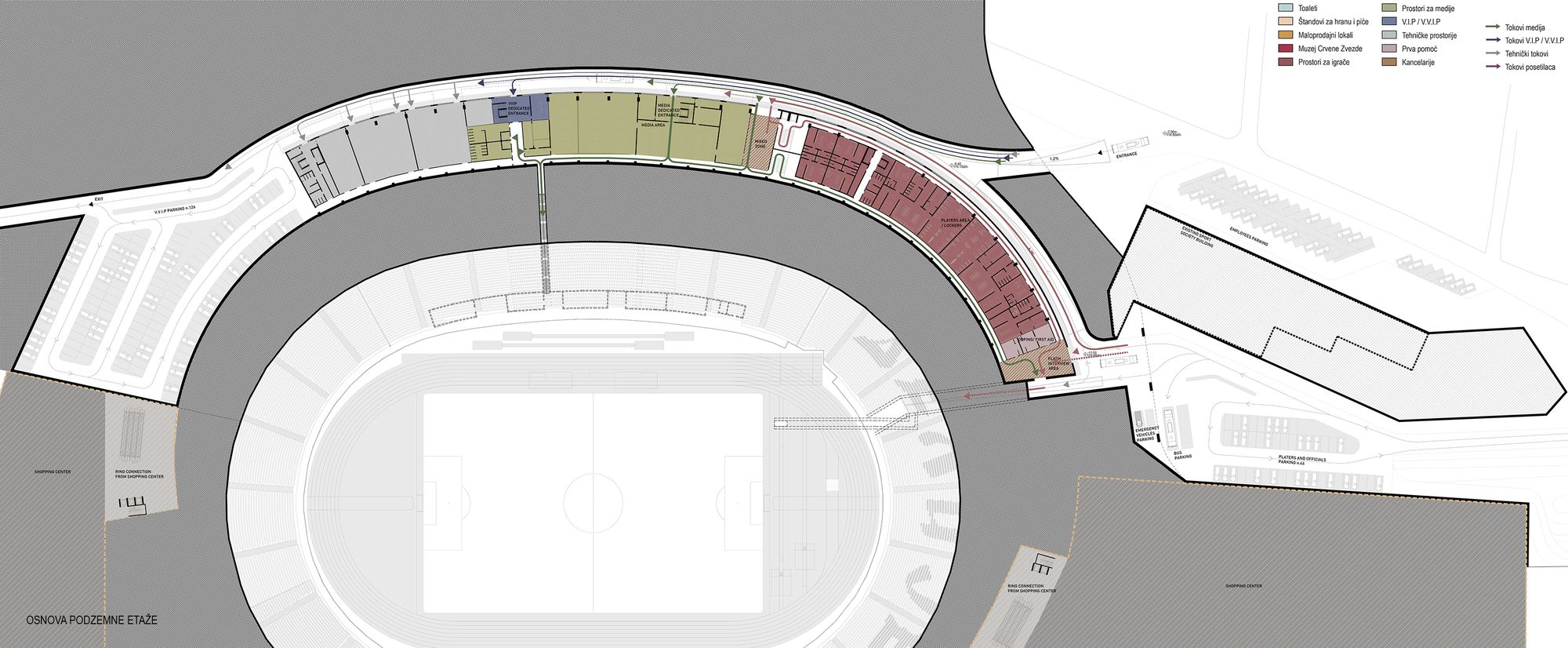 Podzemna etaža uvedena je ispod zapadne i delom severne tribine s podzemnim kolskim pristupom.