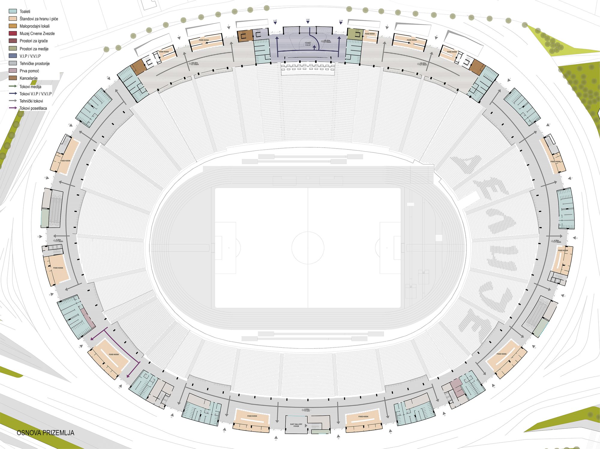 Funkcionalno, stadion je kompletno rekonstruisan kako bi odgovorio na složene zahteve UEFA standarda. Podzemna etaža uvedena je ispod zapadne i delom severne tribine s podzemnim kolskim pristupom. Ovaj kolski pristup omogućava kontrolisani ulaz autobusa s timovima koji toplom vezom kroz miks zonu ulaze u objekat. Na ovoj etaži smeštene su svlačionice i prateće prostorije za igrače, doping kontrola, prostorije za predstavnike medija, sudije i delegate, magacinski prostori, VVIP parking kao i poseban ulaz za VIP goste.