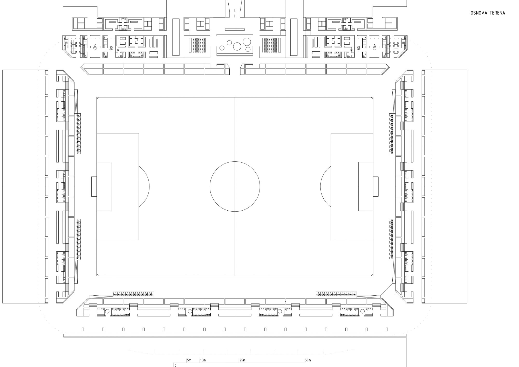 Plato oko stadiona pruža mogućnost lakog pristupa svim sadržajima, a duž koridora postavljeni su punktovi za ketering, prvu pomoć i toalete.