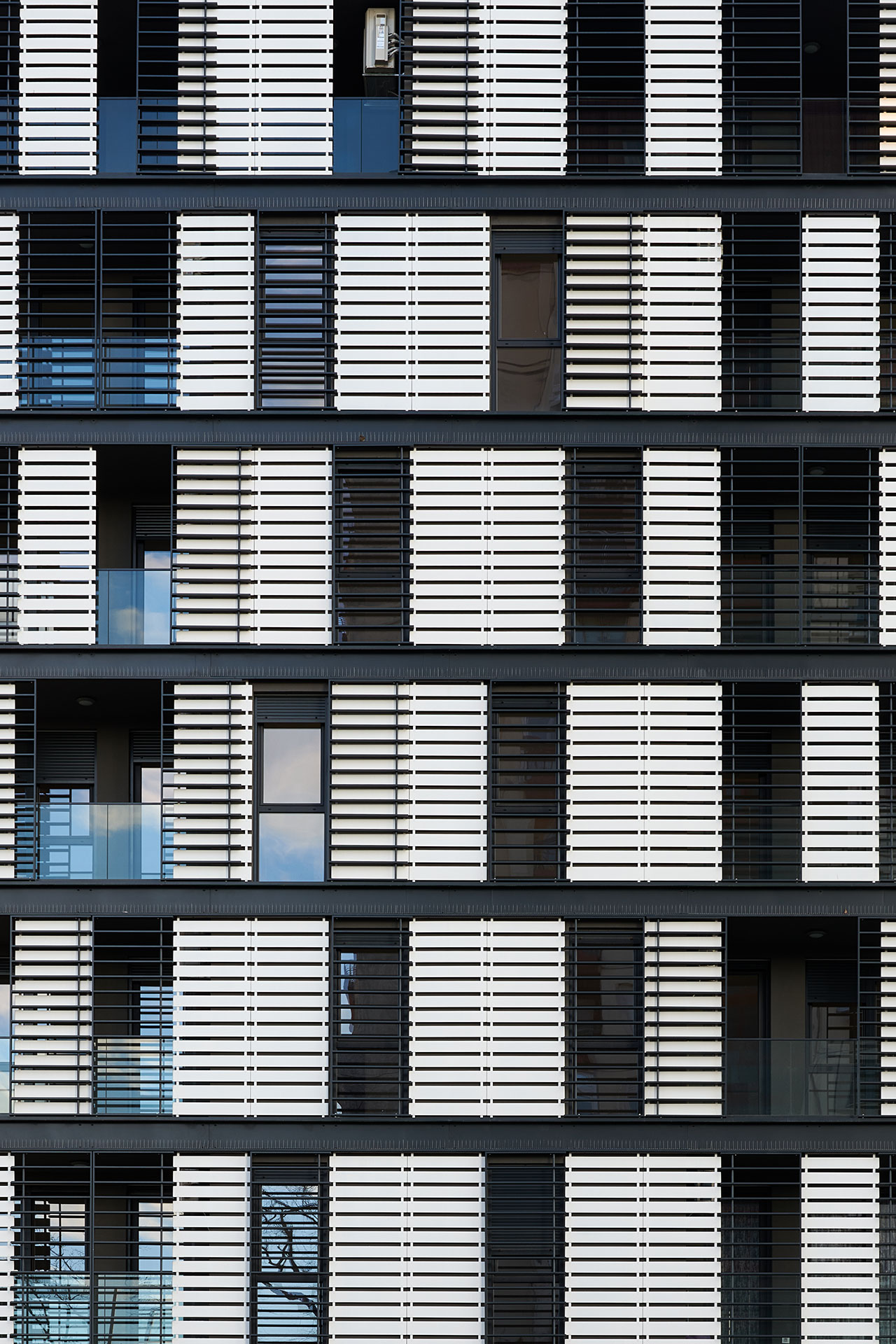 Dinamiku fasade karakterišu klizni brisoleji tamnosive boje sa horizontalnom podelom, dok beli fiksni paneli omogućavaju prožimanje tamnih brisoleja kroz njih.