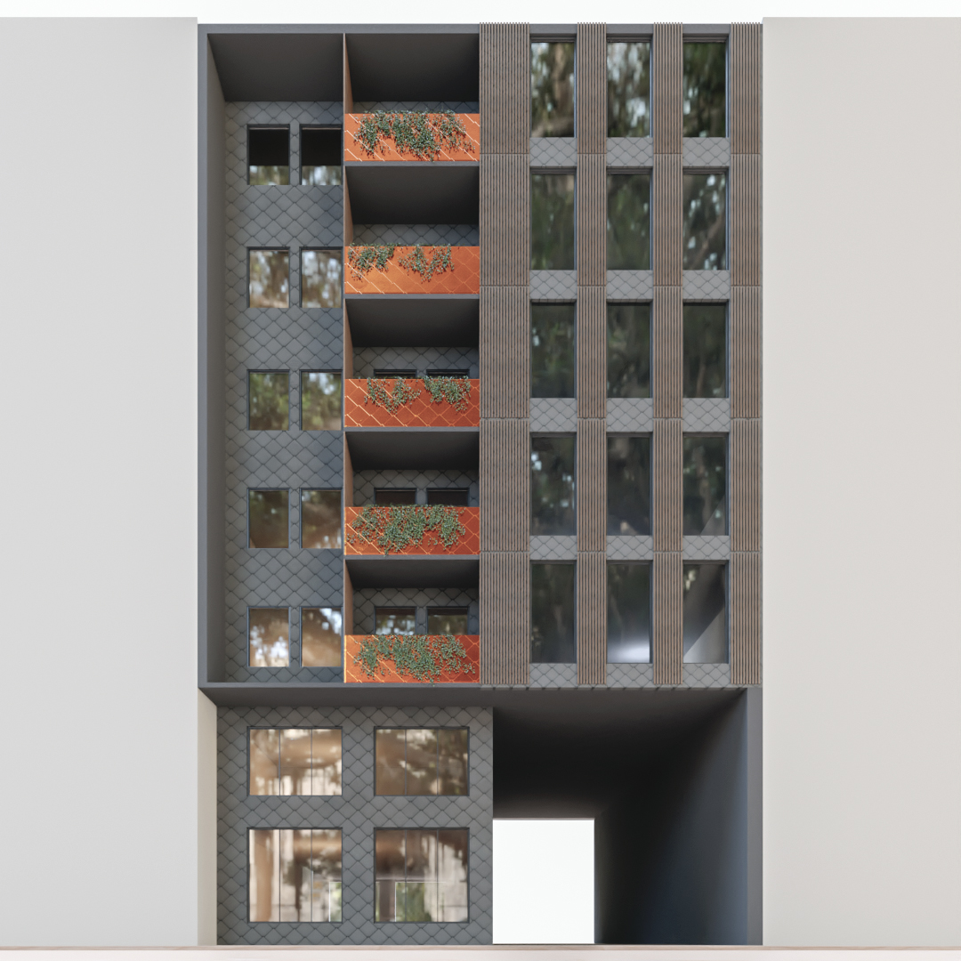 Vertikalne trake iz prethodnih rešenja su eliminisane, međutim, povećani su otvori na ispustu fasade, dok je poslednja etaža dobila balkon.