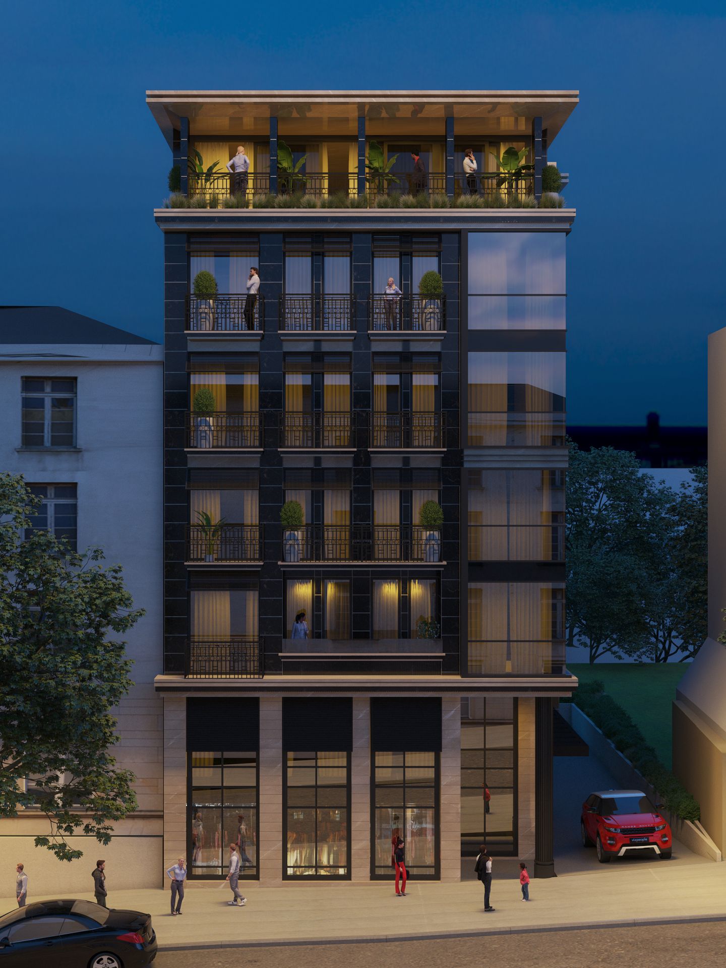 Oblikovanjem planiranih korpusa stambeno-poslovnog objekta primenjeni su formati arhitektonskog oblikovanja sa umerenim odnosima punog i praznog u multiplikovanim i vešto definisanim proporcijama naglašene vertikalnosti ugaonog motiva objekta sa smirenim tretmanima kalkana ka susedu i smirenijim fasadnim planom dvorišne fasade.