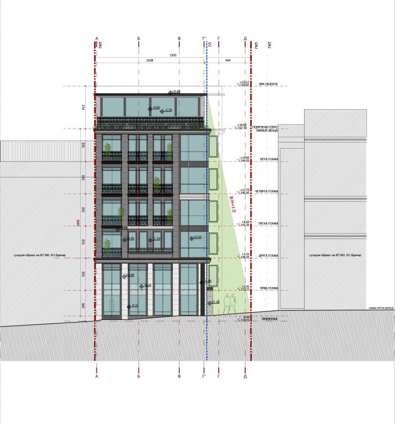 Visina venca i slemena objekta ostvarena arhitektonskim rešenjem, u skladu je sa maksimalnom visinom venca i slemena objekta opredeljene Planom detaljne regulacije blokova između ulica Beogradske, Prote Mateje i Njegoševe, GO Vračar, Beograd.