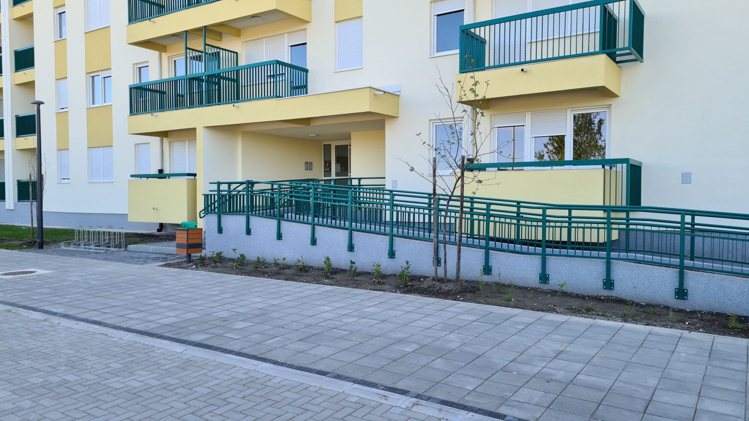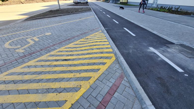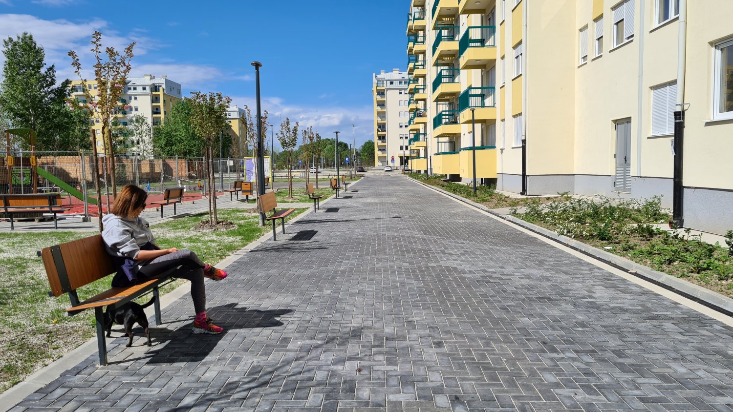 Parterno uređenje u završenim blokovima već je formirano pa su tako u pešačkim zonama postavljene klupe i kante za đubre od kompakt ploča, zasađeno je drveće, zasejana je trava…