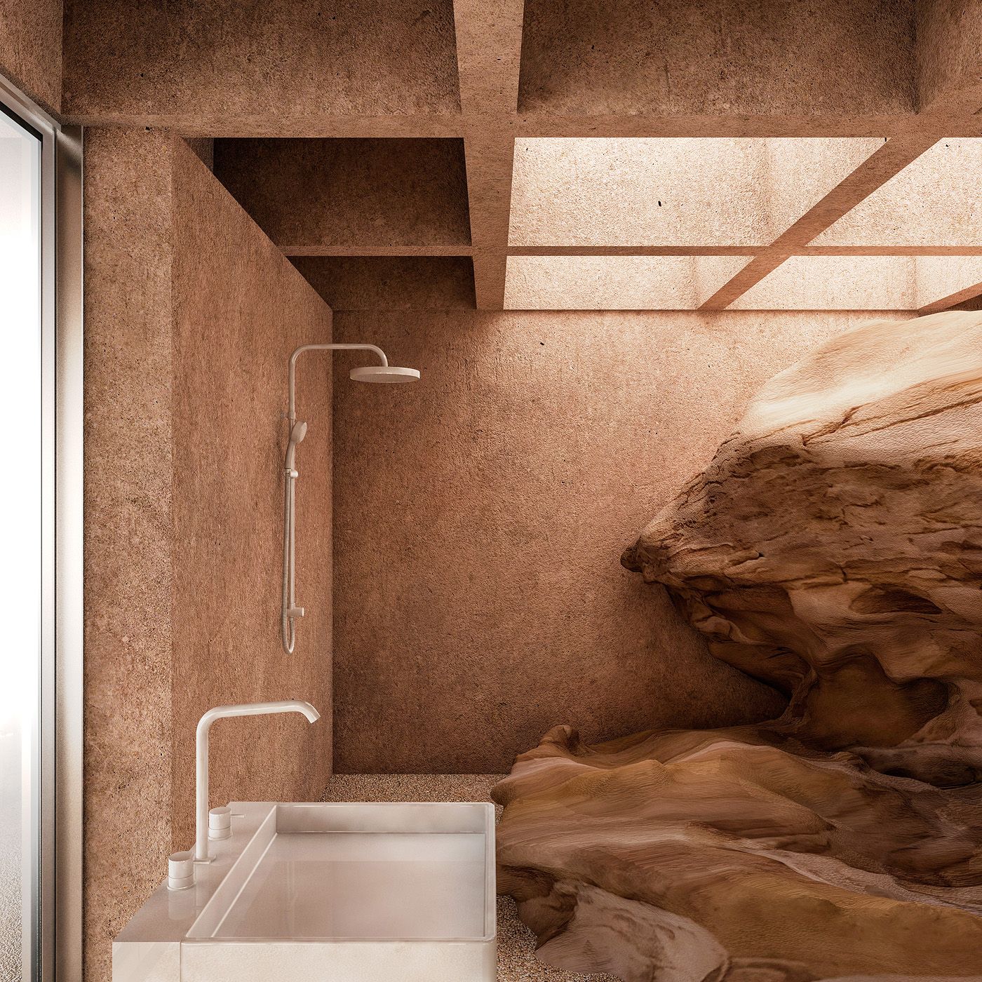 Komad peščara, težine oko 250 tona činio bi centralni deo kuće, a njegova unutrašnjost bi bila mestimično izbušena kako bi se sprovele potrebne instalacije. Njegove prirodne karakteristike vezane za provodljivost i termalnu difuznost omogućavaju da se apsorbuje toplota te bi se kuća ovako dodatno hladila na pasivan način.