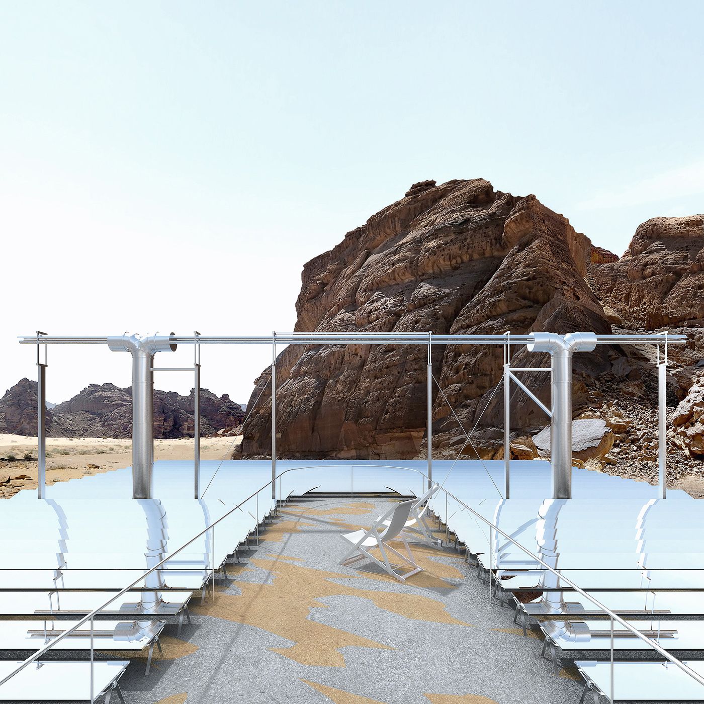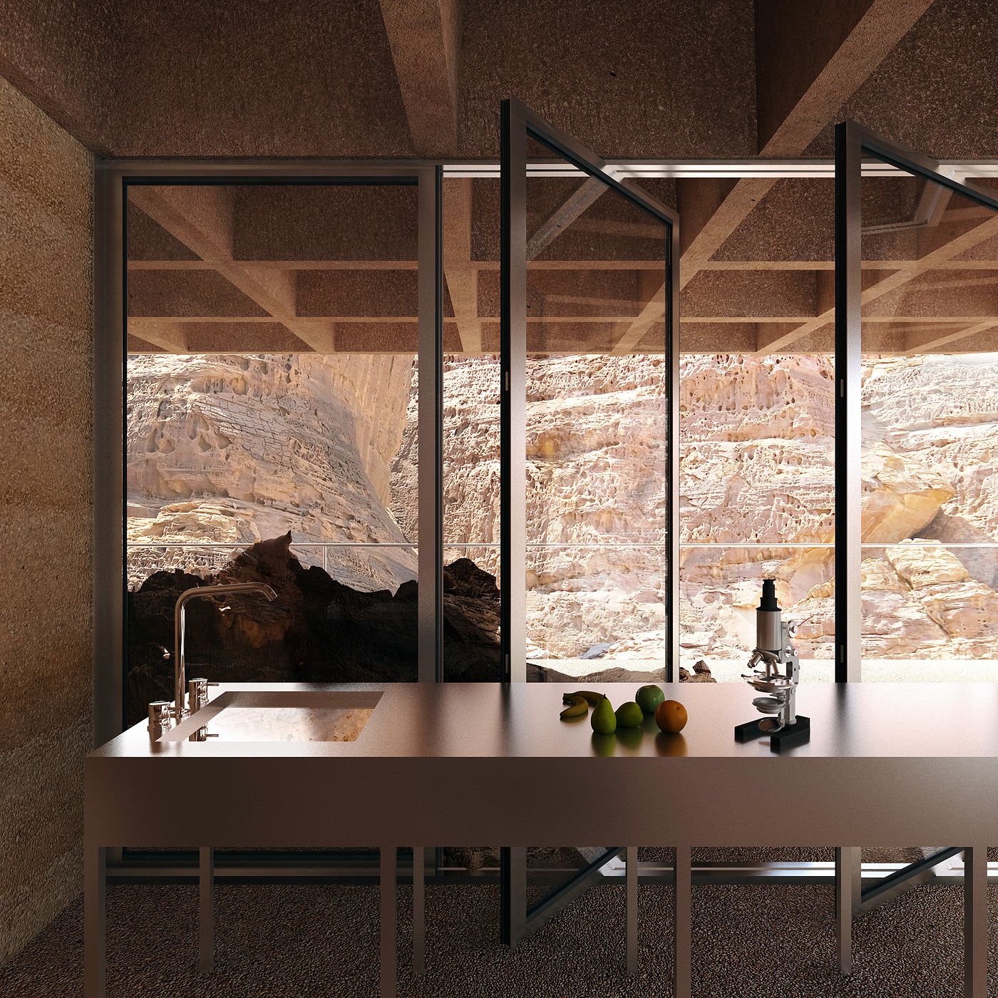 Kroz projekat su favorizovani lokani materijali pri formiranju glavne strukture i tu je predviđen kamen, pesak i nabijena zemlja. Naravno, ovaj objekat kombinuje lokalne materijale sa drugim izdržljivim materijalima poput stakla, nerđajućeg čelika i aluminijuma, kako bi se obezbedio ugodan smeštaj uprkos neprijateljskoj klimi pustinje Al-‘ula.