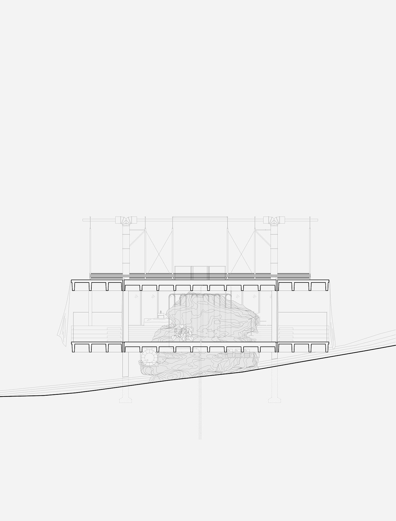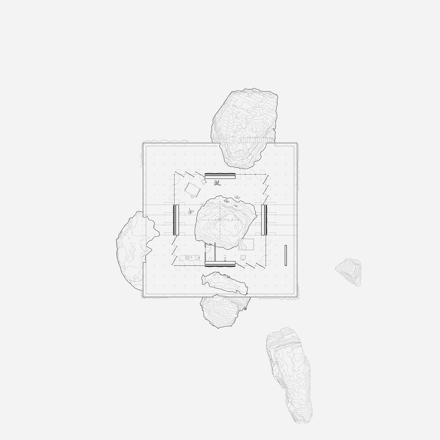 Dve ploče, koje spajaju postojeće stene zajedno sa centralnom stenom koje u konstrukciji vrše ulogu stubova, stvaraju okvir kuće koja pruža pogled na nesvakidašnje okruženje. Svi tehnički elementi, poput toplotne pumpe, rezervoara za vodu, potrebnih baterija i solarnih generatora, smešteni su ispod i iznad ove dve ploče.