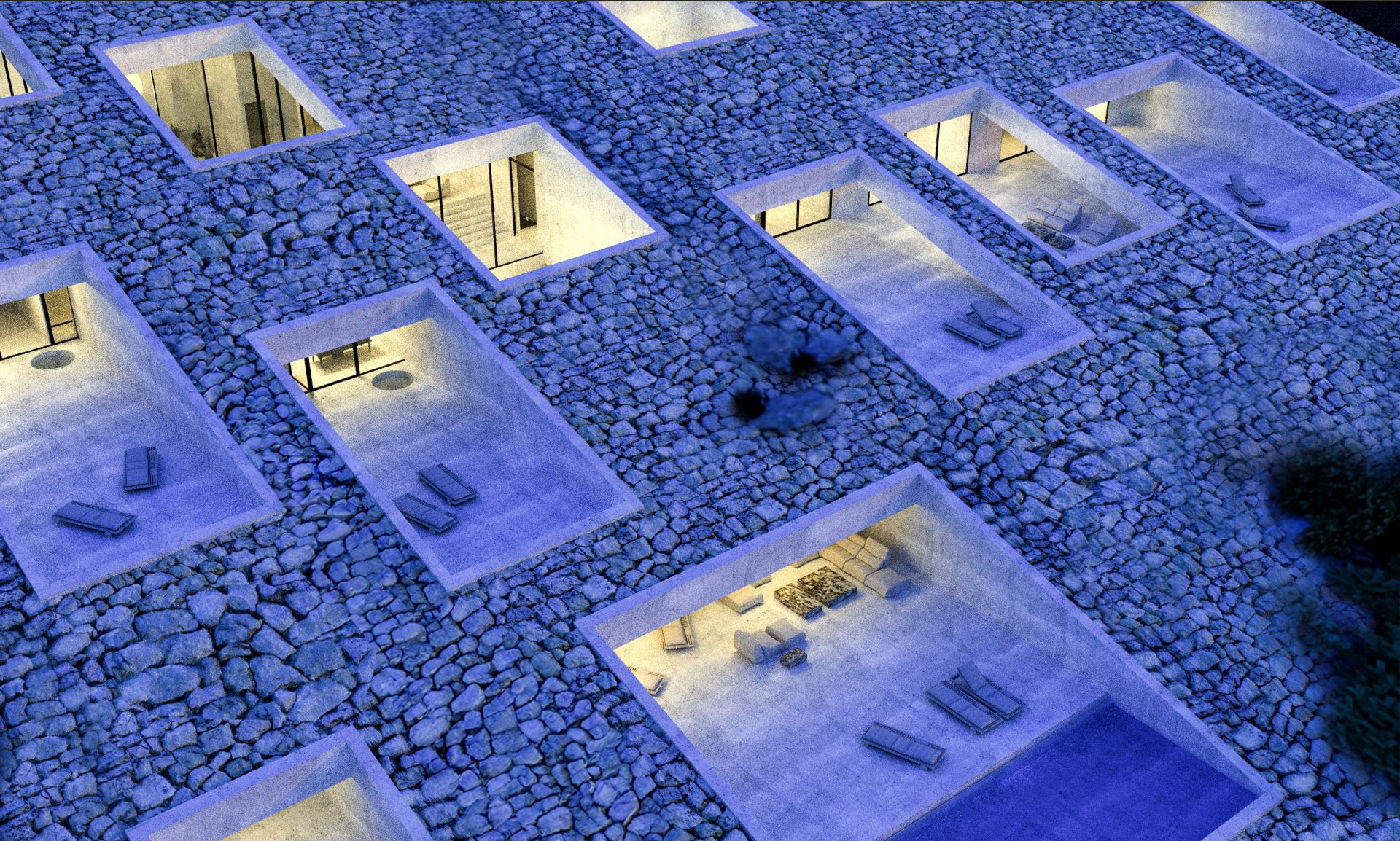 „Struktura je ukopana u padinu, tako da arhitektura deluje gotovo kamuflirano, koristeći grubu kamenu površinu kao krov, stapajući se sa okolnim stenovitim pejzažom i čuvajući prirodnu estetiku ostrva. Struktura je isprekidana višestrukim pravougaonim otvorima koji služe kao terase i atrijumi“, kažu iz Proarha.