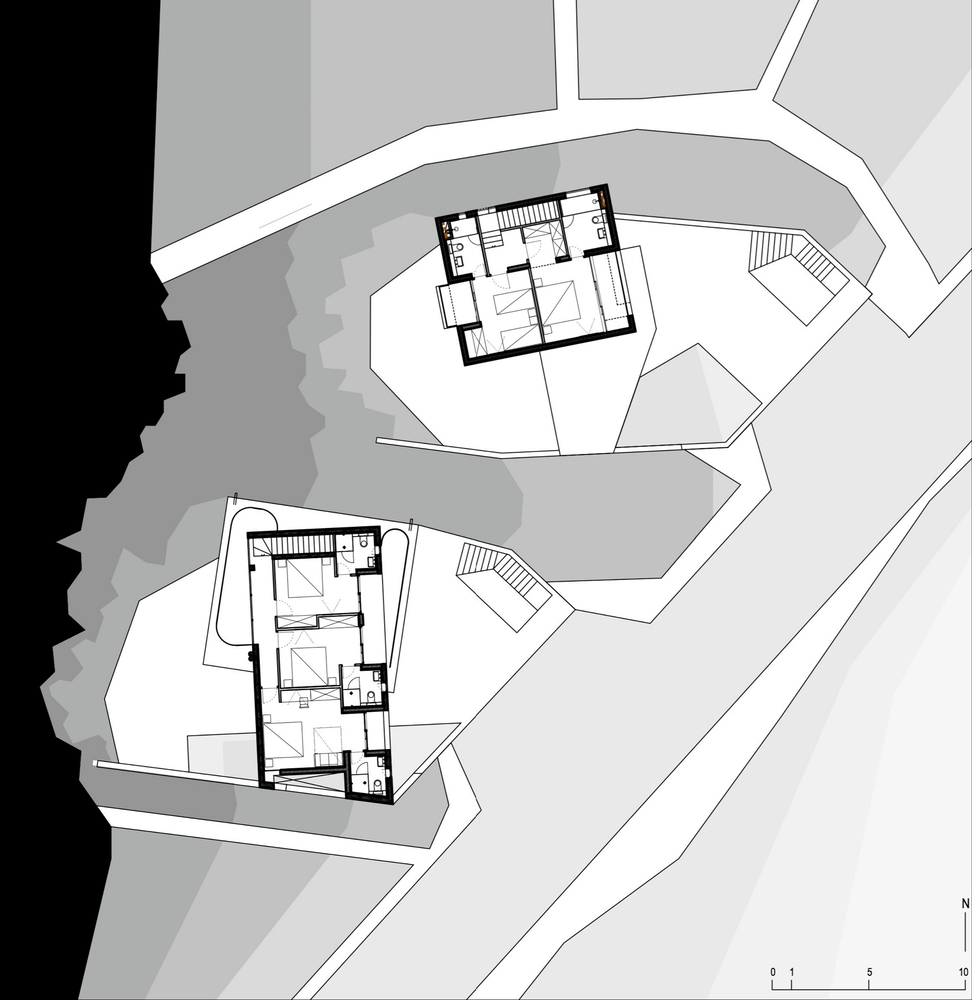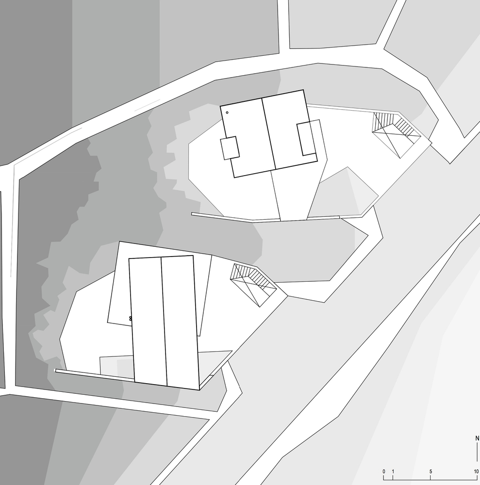 Položaj kuće na platformi definiše južno dvorište omeđeno brazdama sa iskopanog terena, uokvireni natkriveni prolaz i severna terasa sa pogledom na more.