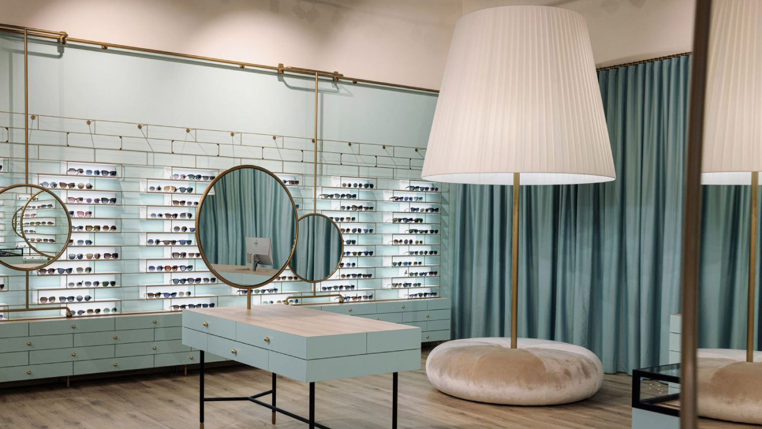 Klijent je imao jasnu predstavu koliko modela naočara želi da izloži u kom elementu, te je fioka postala merna jedinica i „gradivni blok“ za čitav enterijer. Masivne lampe, rotirajuća ogledala…