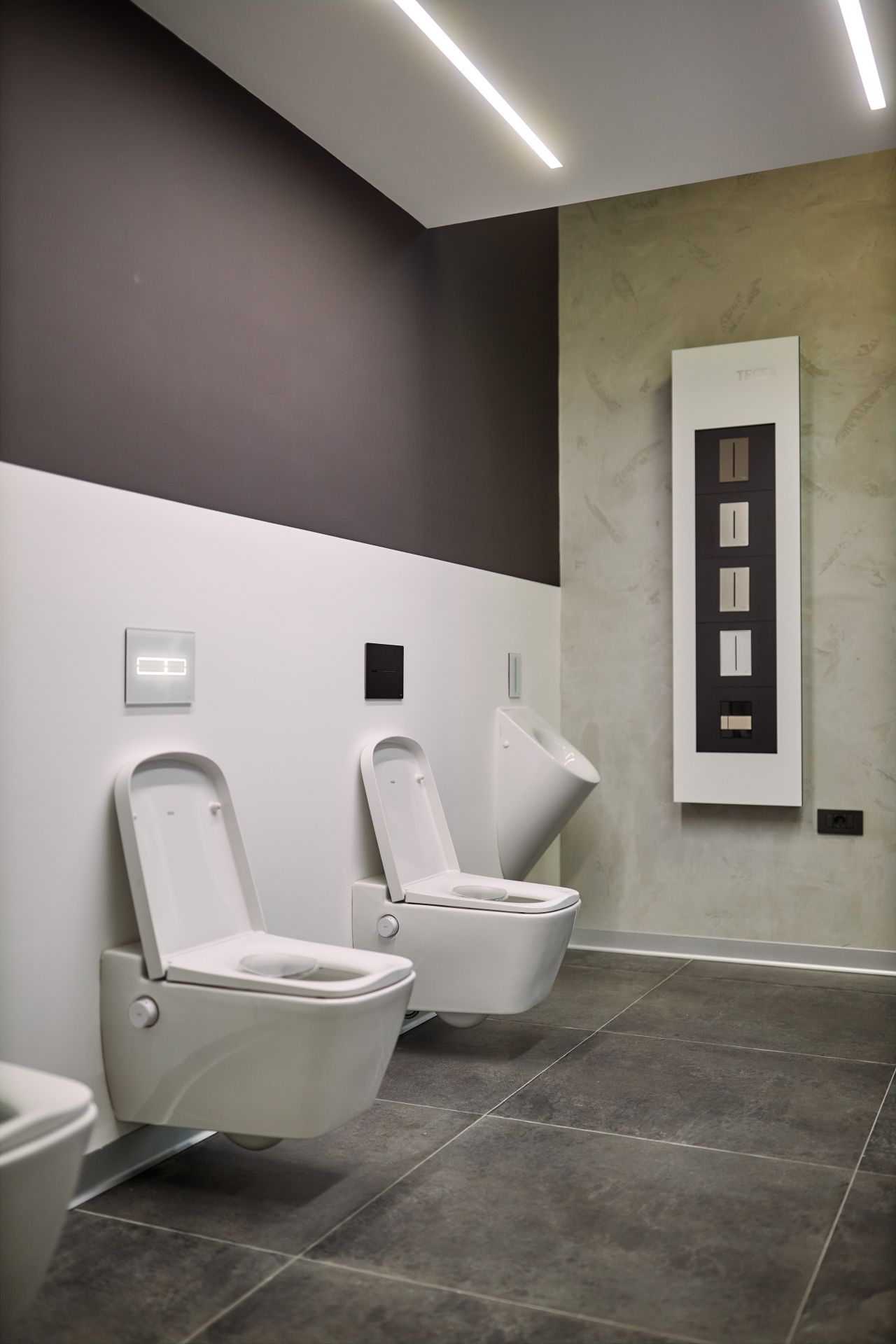 Moderan i fluidan prostor odiše prijatnom atmosferom, te poziva na razgledanje svih TECE rešenja za dovod vode u kuću i opet odvod vode iz kuće.