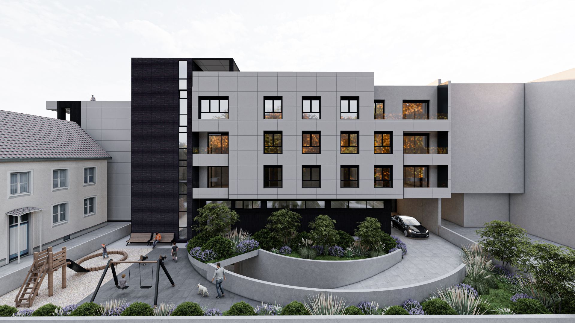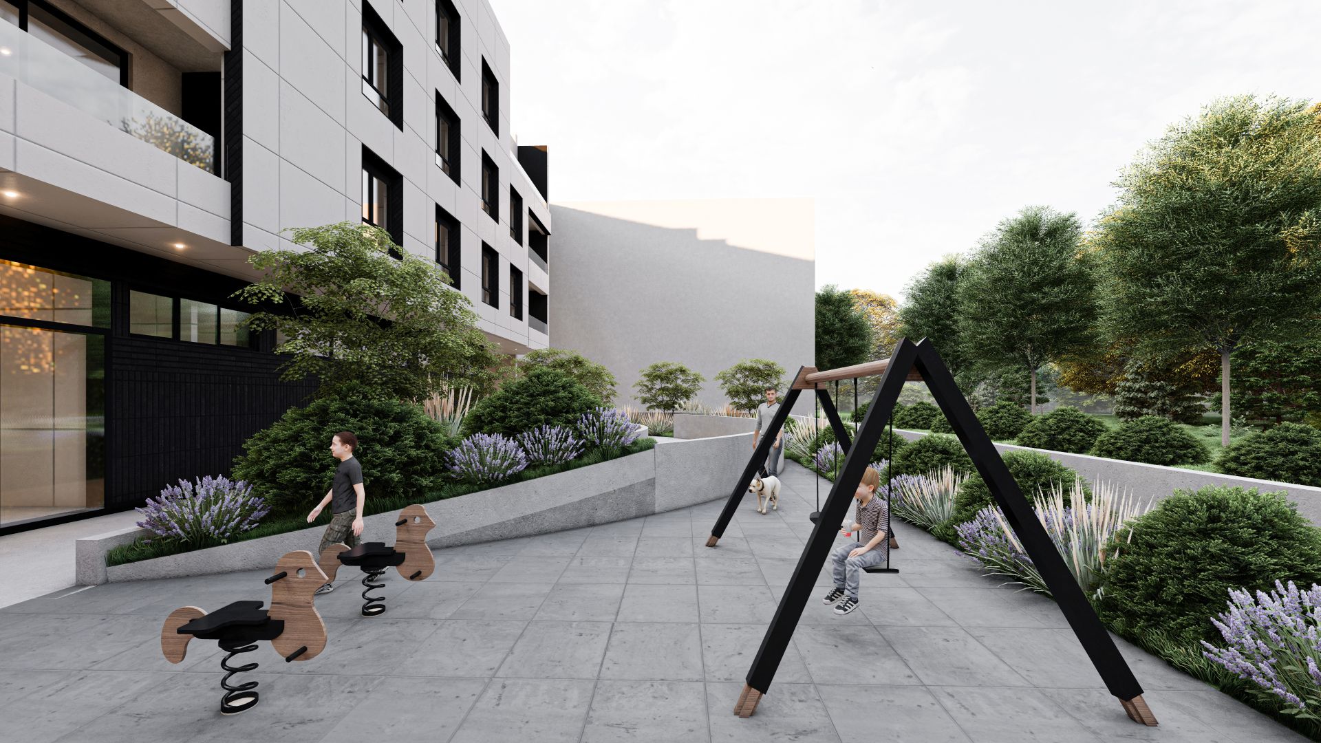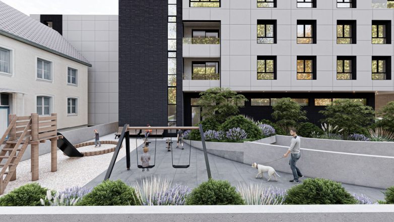 Dvorište sa dečijim igralištem i urbanim mobilijarom; Vizuelizacija: Metfer projekt