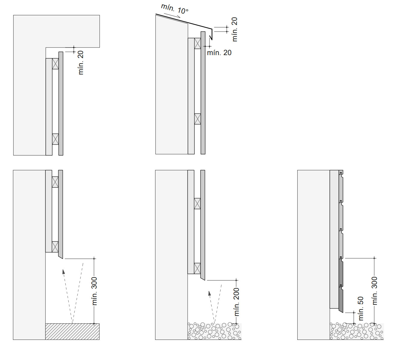 Preporučljivo je da da drvena fasada bude bude odignuta od tla oko 30 cm. Ako je na tlu postavljen šljunak, ovo rastojanje može biti i 20 cm. Ukoliko želite jo manji razmak od tla, preporučuje se horizontalno postavljanje drveta na fasadi što omogućava da se donji profili mogu kasnije zameniti ukoliko je potrebno.