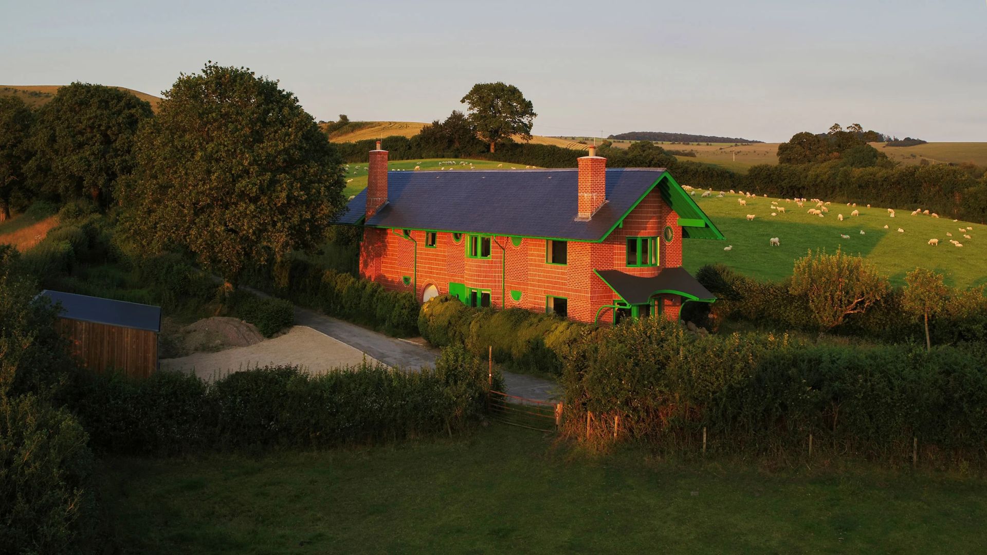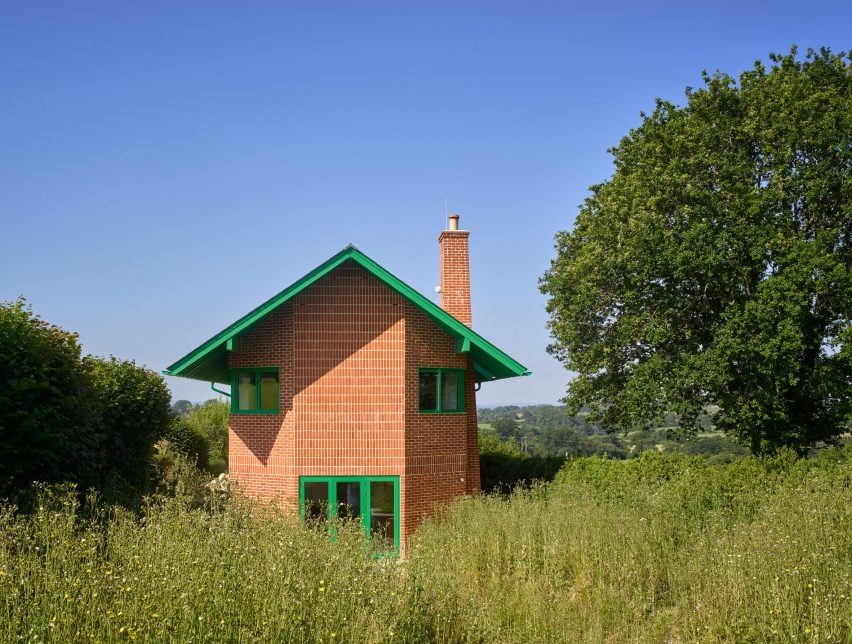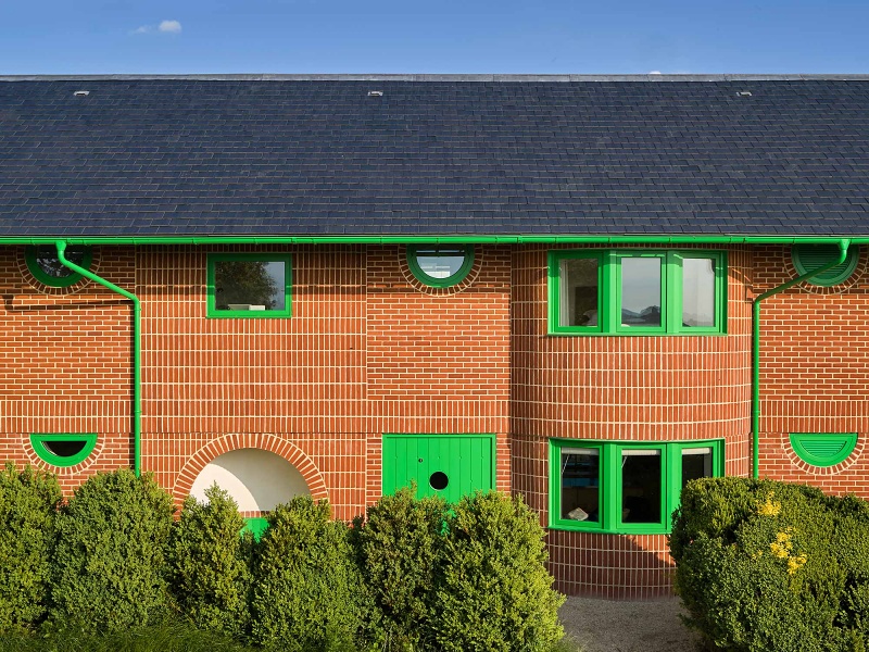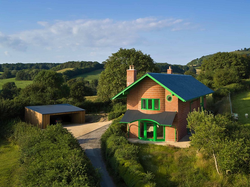 Smešten u ruralnom Dorsetu, dvospratni porodični dom odlikuje se razigranom ali suzdržanom spoljašnjošću, koja suprotstavlja šablon od crvene opeke sa jarko zelenim detaljima.