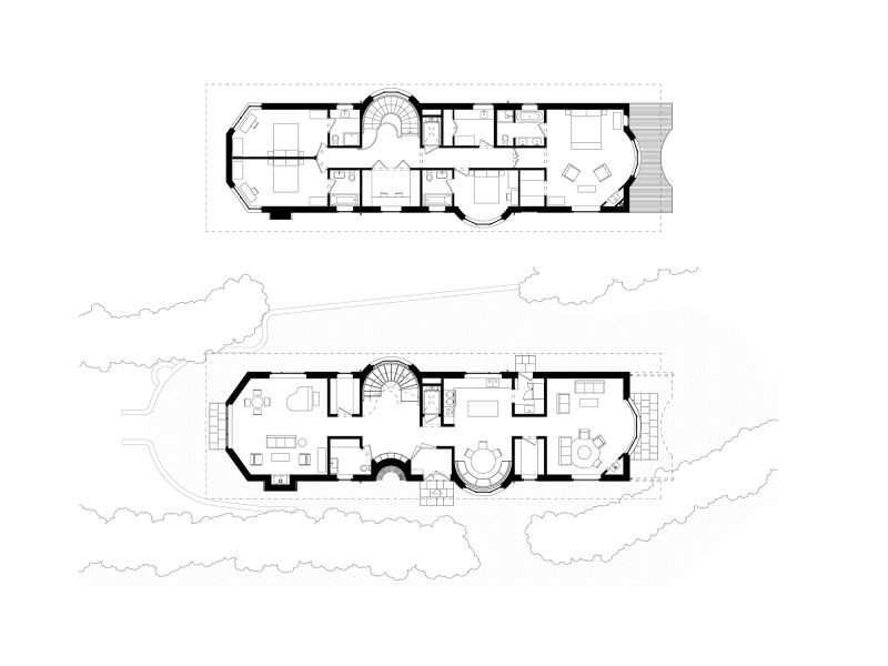 Stepenište je centralna karakteristika kuće – raskošan, skulpturalni dizajn koji se penje do prvog sprata i spušta se kroz izbočeni prozor u erkeru.
