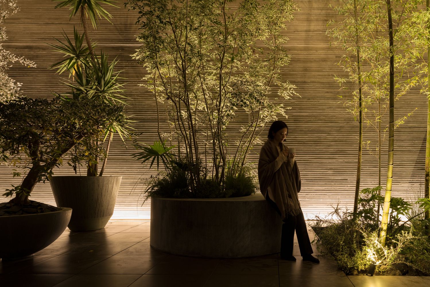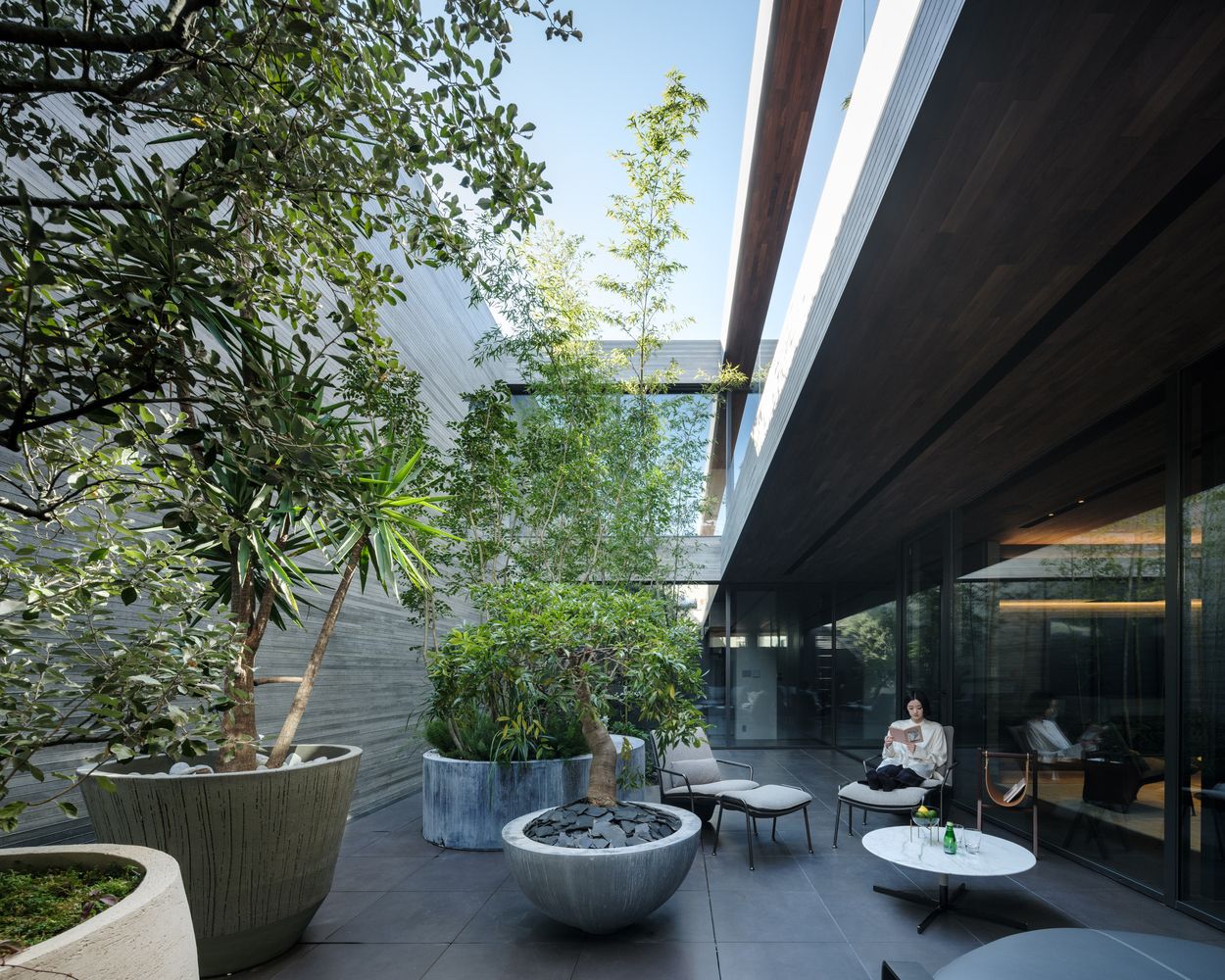 Svi otvoreni prostori su oivičeni zastakljenjem kako bi se osiguralo da što više prirodnog svetla dopre u životne prostore koji okružuju dvorišta, ali i da se omogući pogled na bambuse i ostalo zasađeno zelenilo.
